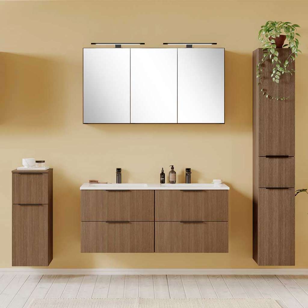 Badezimmermöbel Set Badmöbel Set in Eiche dunkel mit Holzwerkstoff Oberfläche (vierteilig) - Mit Metallgriffen - Vierteilig - Zerlegt, zum leichten Selbstaufbau (Montageanleitung liegt bei) - In modernem Design - Breite Variante ist mind. benötigte Gesamtfläche, Einzelmaße sind unten separat aufgeführt - Mit LED Beleuchtung - Aus deutscher Produktion - Türanschlag beidseits montierbar - Badezimmerset aus Holzwerkstoff und Spiegelglas - In Holzoptik melaminbeschichtet - Für Energieeffizienzklasse G - Bad-set in Eiche dunkel - Badezimmermöbel Set 180 cm Breit, 180 cm Hoch, 47 cm TiefInformationen zur Lieferung:Die Zustellung dieses Produktes erfolgt per Spedition. Sie werden vor der Auslieferung durch die ausliefernde Spedition kontaktiert.Terminvereinbarung: Sie werden frühzeitig (ein paar Tage im Voraus) durch die ausliefernde Spedition kontaktiert und Ihnen der Auslieferzeitpunkt mitgeteilt. Die Kontaktaufnahme erfolgt per Telefon. Bei telefonischer Nichterreichbarkeit werden Sie per Postkarte über das Auslieferdatum informiert.Die Lieferung erfolgt aus Kostengründen Frei Bordsteinkante (bis zur ersten verschlossenen Tür). Für den weiteren Transport der Ware sind Sie eigenverantwortlich.Die Auslieferung erfolgt von Montags bis Freitags. Eine Zustellung an Sonn- und Feiertagen ist nicht möglich.