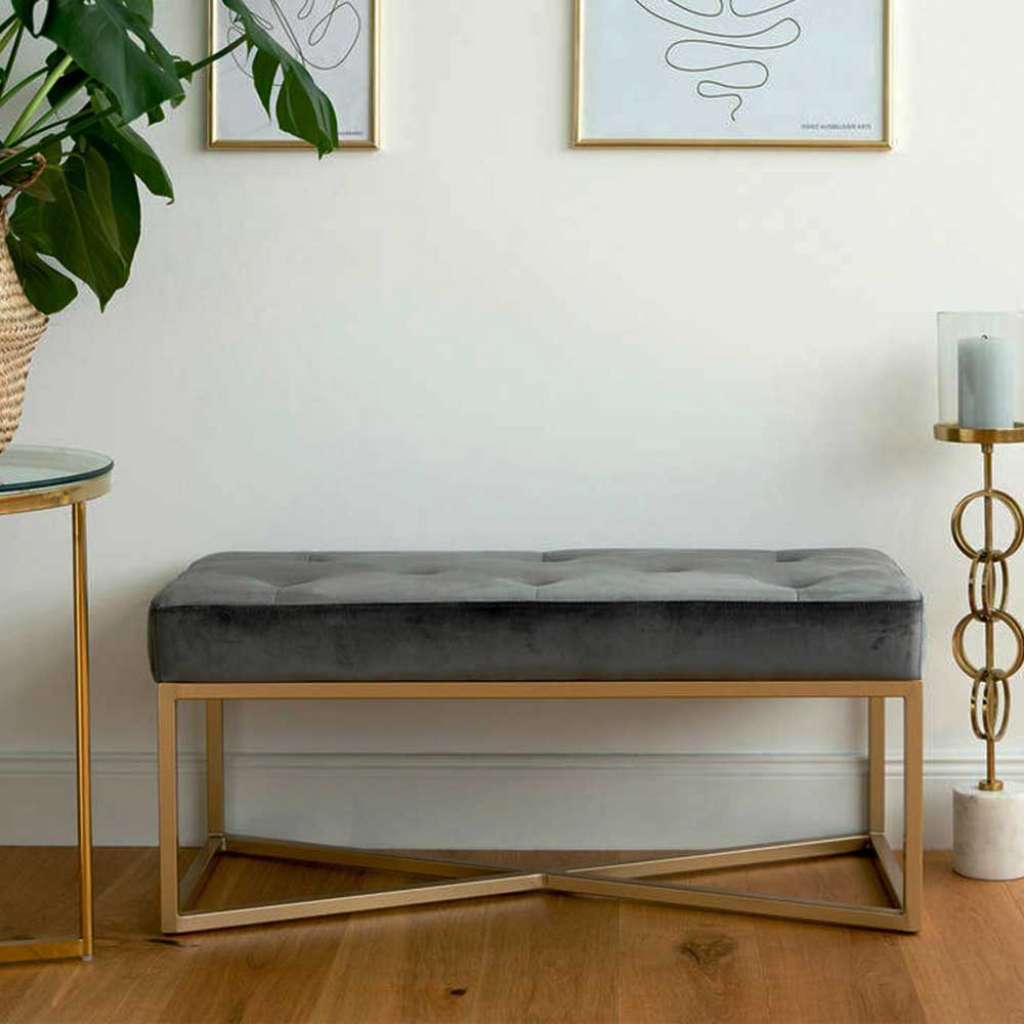Polsterbank aus Samt Bügelgestell - Sitzbreite (in cm) : 90 - Mit Schaumstoffpolsterung - Zerlegt, zum leichten Selbstaufbau (Montageanleitung liegt bei) - In rechteckiger Form - Bank in modernem Design - Sitztiefe (in cm) : 40 - Mit Bügelgestell aus Metall - Schlafzimmer Bank aus Samt und Metall - Mit Bezug aus Samt (100 % Polyester) - Sitzhöhe (in cm) : 40 - Betttruhe in Grau und Goldfarben - Ankleidebank 90 cm Breit, 40 cm Hoch, 40 cm TiefInformationen zur Lieferung:Die Zustellung dieses Produktes erfolgt per GLS-Paketdienst. Sollten Sie bei der Erstzustellung nicht angetroffen werden, hinterlässt der Zusteller in Ihrem Briefkasten eine Benachrichtigungskarte mit dem Hinweis auf eine zweite Anlieferung. Sollte in Ihrer Nähe ein GLS-Paketshop sein, so wird die Ware dort hinterlassen und Sie können die Ware dort abholen. Die Auslieferung erfolgt von Montags bis Freitags. Eine Zustellung an Sonn- und Feiertagen ist nicht möglich.