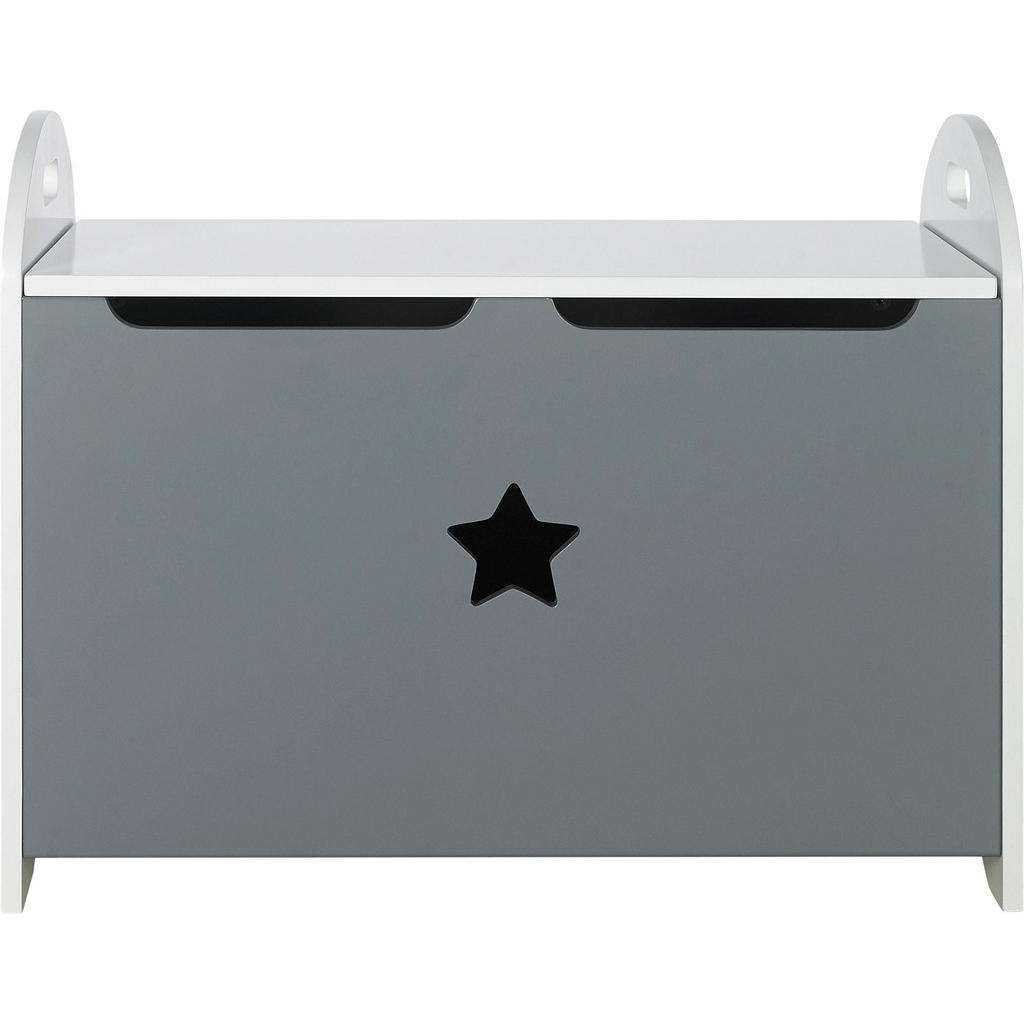 Diese Spielzeugtruhe in Weiß und Grau hilft dabei, in der eigenen kleinen Kreativwelt Ordnung zu halten. Sie tritt im klassischen Look auf, der durch die Farbstellung betont wird. Der Stern in der Vorderseite begeistert dabei als dekoratives Designelement. Dank der Aussparungen ist der klappbare Deckel leicht zu öffnen. Darunter befindet sich der Stauraum mit einem Fassungsvermögen von ca. 45 Litern. Damit Mama oder Papa die Spielzeugtruhe in Weiß und Grau bei Bedarf leicht hochheben können, besitzt sie praktische Tragegriffe. Die Oberflächen wurden lackiert und sind somit bestens für den Alltag im Kinderzimmer präpariert. Richten Sie Ihrem Nachwuchs mit dieser Truhe sowie weiteren Möbeln aus derselben Serie einen eigenen Bereich für Spaß und gute Laune ein!