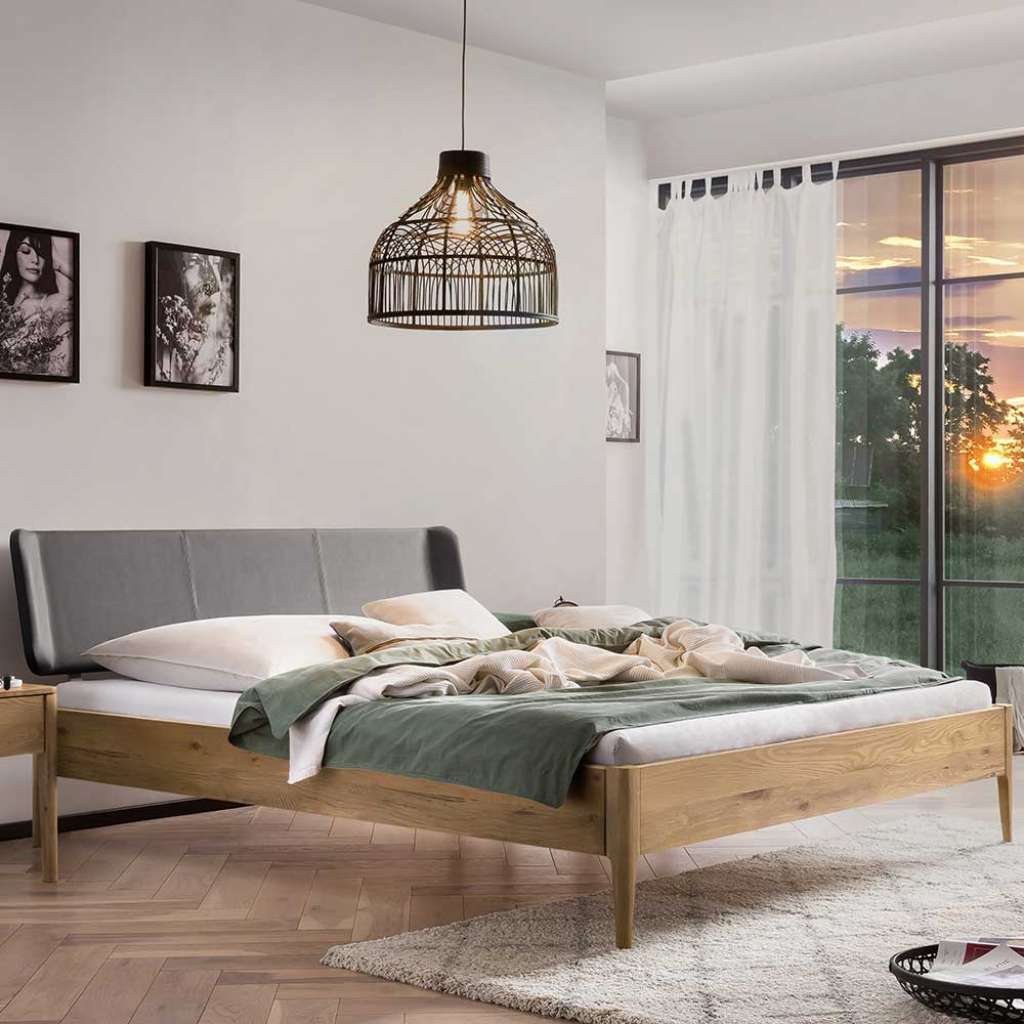140x00 cm Bett Wildeiche geölt mit Polsterkopfteil in Dunkelgrau