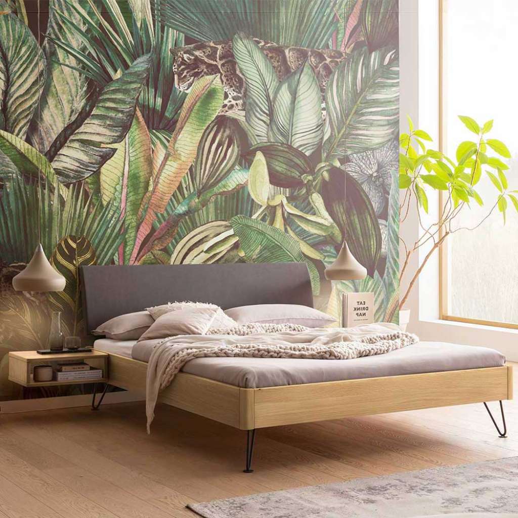 Bettgestell Eiche hell massiv mit Vierfußgestell aus Metall Polster Kopfteil