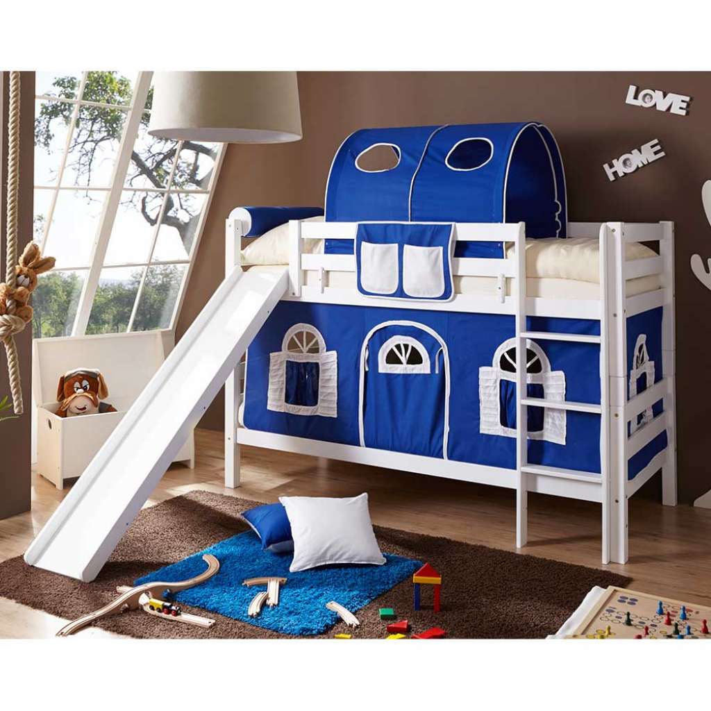 Informationen über Rutschbett in Weiß Buche massiv Stofftunnel in Blau