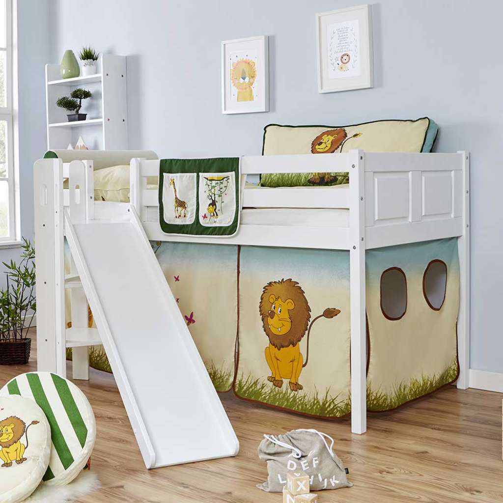 Kinder Halbhochbett in Weiß Buche massiv Vorhang im Zootier Design