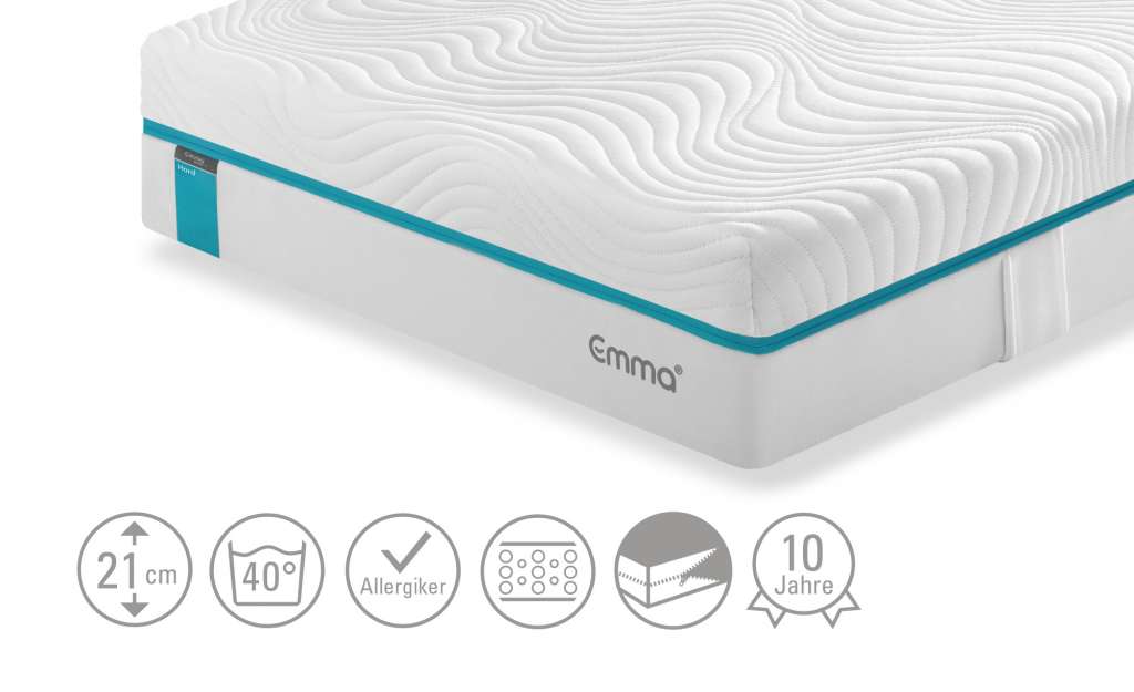 Unser Produkt Emma Kaltschaummatratze Emma Select Smart gibt es in den Farben: weiß Der Hersteller Emma ist bekannt für die hohe Qualität der verwendeten Materialien. Zudem hat das Produkt folgende Besonderheiten: adaptives und offenzelliges AquaGel für höchste Körperanpassung, hochelastischer, komplett abnehmbarer und waschbarer (bis 40 Grad) Premiumbezug mit Anti-Rutsch-Beschichtung an der Unterseite, ideal für den "Hart"-Schläfer durch festeres Liegegefühl mit hervorragender Körperstützung. · Prüfsiegel: Öko-Tex Standard 100 · Aktion: Newsletter-Anmeldung 10€ Willkommens-Gutschein. · Aktion: 0% Finanzierung im Online-Shop, eff. Jahreszins und gebundener Sollzinssatz (jährl.) 0,00 % bis zu 50 Monate. Ab einer Finanzierungssumme von 100€. · Aktion: 3% Kundenkarten-Rabatt. · Der Artikel befindet sich in der Höffner-Kategorie: Matratzen & Zubehör - Matratzen-Arten - Kaltschaum-Matratzen.
