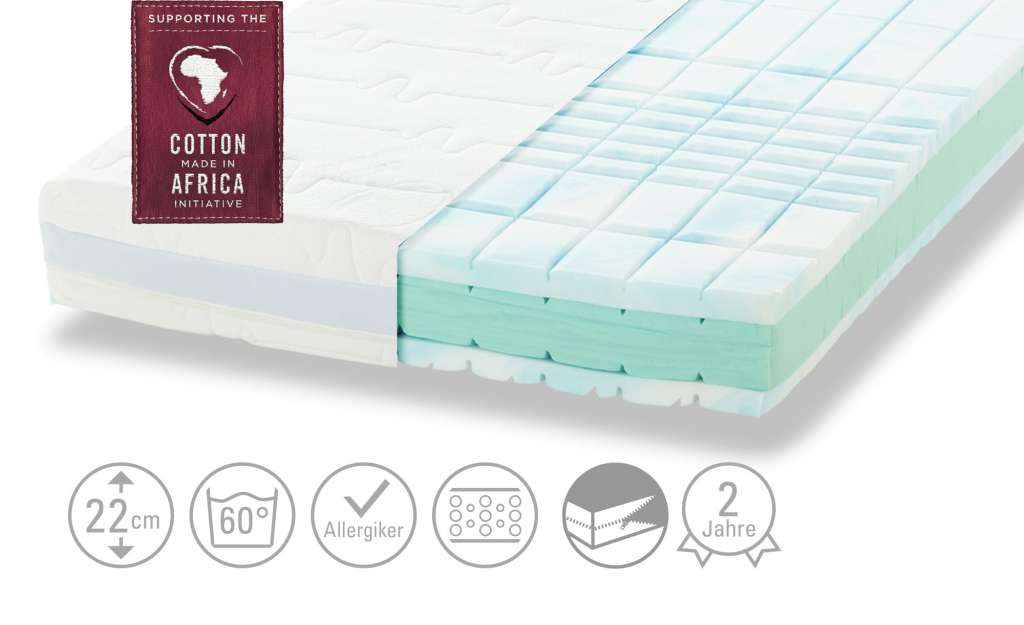 Unser Produkt Kaltschaummatratze Medic Blue Air gibt es in den Farben: weiß Der Hersteller ist bekannt für die hohe Qualität der verwendeten Materialien. Zudem hat das Produkt folgende Besonderheiten: Punktelastischer 7-Zonen Air`Core Kern , Doppeltuchbezug mit Baumwolle des Projekts "Cotton made in Africa" für mehr Nachhaltigkeit, Bezug mit Klimaband und 4 Griffen gearbeitet und mittels vierseitigem Reißverschluß abnehmbar und bis 60 Grad waschbar. · Prüfsiegel: Öko-Tex Standard 100 · Aktion: Newsletter-Anmeldung 10€ Willkommens-Gutschein. · Aktion: 0% Finanzierung im Online-Shop, eff. Jahreszins und gebundener Sollzinssatz (jährl.) 0,00 % bis zu 50 Monate. Ab einer Finanzierungssumme von 100€. · Aktion: 3% Kundenkarten-Rabatt. · Der Artikel befindet sich in der Höffner-Kategorie: Matratzen & Zubehör - Matratzen-Arten - Kaltschaum-Matratzen.