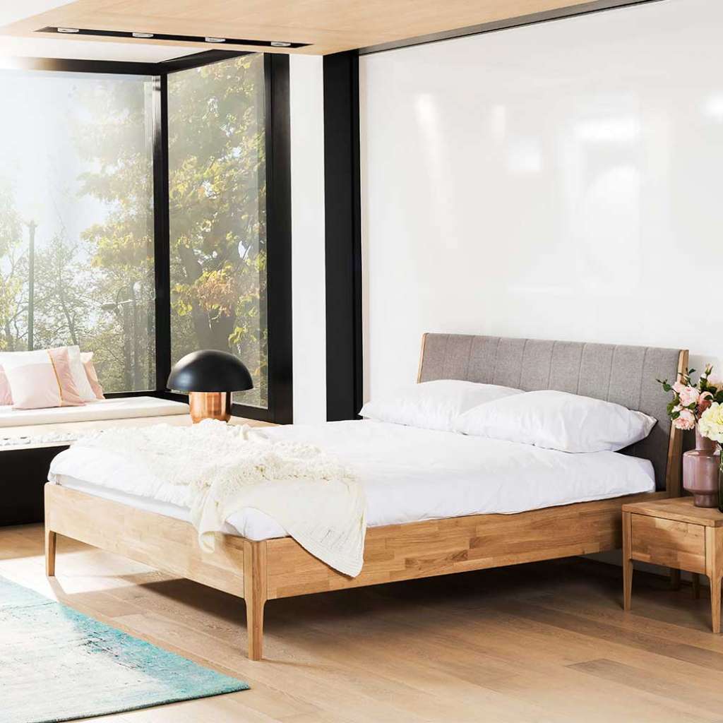 Bett mit Polsterkopfteil in Wildeiche Honigfarben Grau