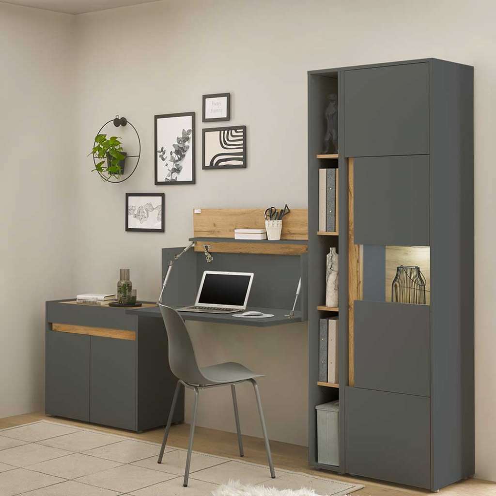 (vierteilig) - Vierteilig - Zerlegt, zum leichten Selbstaufbau (Montageanleitung liegt bei) - Bürokombination in modernem Design - Melaminbeschichtet - Mit Türen wahlweise rechts und links montierbar - Büromöbel Set aus Holzwerkstoff - Büromöbel Komplettset in Anthrazit und Wildeichefarben - Breite Variante ist mind. benötigte Gesamtfläche, Einzelmaße sind unten separat aufgeführt - Büroausstattung 250 cm Breit, 200 cm Hoch, 40 cm TiefVarianten - 001: Standardausführung - 002: mit LED Beleuchtung / für Energieeffizienzklasse LEDInformationen zur Lieferung:Der Versand dieses Artikels erfolgt per DHL-Superservice. Dieses beinhaltet folgenden Service für Sie:Terminvereinbarung: Sie werden frühzeitig (ein paar Tage im Voraus) durch die ausliefernde Spedition kontaktiert und Ihnen der Auslieferzeitpunkt mitgeteilt. Die Kontaktaufnahme erfolgt per Telefon. Bei telefonischer Nichterreichbarkeit werden Sie per Postkarte über das Auslieferdatum informiert.Lieferung Frei Verwendungsstelle: Der Transport erfolgt an Ort und Stelle. Sie bestimmen, wohin Sie die Ware getragen haben möchten. Ob Dachgeschoss, Erdgeschoss, Schlaf- oder Wohnzimmer - die Ware wird an den von Ihnen gewünschten Ort vertragen.Zwei Speditionsfahrer vertragen die Ware: keine Mithilfe beim Entladen und Vertragen der Ware nötig. Die Speditionsfahrer sind auf den Möbeltransport spezialisiert und entsprechend geschult, somit sind Transportreklamationen nahezu ausgeschlossen.Die Auslieferung erfolgt von Montags bis Freitags. Eine Zustellung an Sonn- und Feiertagen ist nicht möglich.Alle aufgeführten Serviceleistungen sind im Artikelpreis enthalten. Es fallen keine weiteren Kosten für Sie an. Bei Insellieferungen kann nur ein reiner Abgabeservice angeboten werden - das Vertragen der Ware + Verpackungsentsorgung entfällt hierbei.