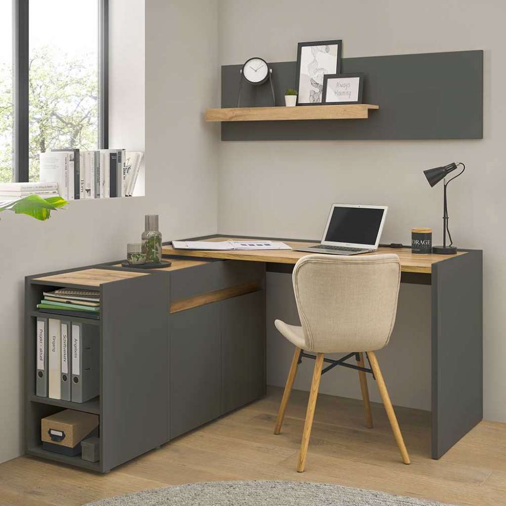 (vierteilig) - Vierteilig - Zerlegt, zum leichten Selbstaufbau (Montageanleitung liegt bei) - Bürokombination in modernem Design - Melaminbeschichtet - Büromöbel-set aus Holzwerkstoff - Büromöbel Komplettset in Anthrazit und Wildeichefarben - Breite Variante ist mind. benötigte Gesamtfläche, Einzelmaße sind unten separat aufgeführt - Büroausstattung 143 cm Breit, 117 cm Hoch, 143 cm TiefInformationen zur Lieferung:Der Versand dieses Artikels erfolgt per DHL-Superservice. Dieses beinhaltet folgenden Service für Sie:Terminvereinbarung: Sie werden frühzeitig (ein paar Tage im Voraus) durch die ausliefernde Spedition kontaktiert und Ihnen der Auslieferzeitpunkt mitgeteilt. Die Kontaktaufnahme erfolgt per Telefon. Bei telefonischer Nichterreichbarkeit werden Sie per Postkarte über das Auslieferdatum informiert.Lieferung Frei Verwendungsstelle: Der Transport erfolgt an Ort und Stelle. Sie bestimmen, wohin Sie die Ware getragen haben möchten. Ob Dachgeschoss, Erdgeschoss, Schlaf- oder Wohnzimmer - die Ware wird an den von Ihnen gewünschten Ort vertragen.Zwei Speditionsfahrer vertragen die Ware: keine Mithilfe beim Entladen und Vertragen der Ware nötig. Die Speditionsfahrer sind auf den Möbeltransport spezialisiert und entsprechend geschult, somit sind Transportreklamationen nahezu ausgeschlossen.Die Auslieferung erfolgt von Montags bis Freitags. Eine Zustellung an Sonn- und Feiertagen ist nicht möglich.Alle aufgeführten Serviceleistungen sind im Artikelpreis enthalten. Es fallen keine weiteren Kosten für Sie an. Bei Insellieferungen kann nur ein reiner Abgabeservice angeboten werden - das Vertragen der Ware + Verpackungsentsorgung entfällt hierbei.