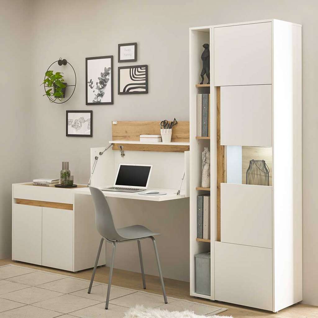 (vierteilig) - Vierteilig - Zerlegt, zum leichten Selbstaufbau (Montageanleitung liegt bei) - Bürokombination in modernem Design - Melaminbeschichtet - Mit Türen wahlweise rechts und links montierbar - Komplettbüro in Weiß und Wildeichefarben - Büromöbel Sets aus Holzwerkstoff - Breite Variante ist mind. benötigte Gesamtfläche, Einzelmaße sind unten separat aufgeführt - Mit klappbarer Tischplatte - Büroausstattung 250 cm Breit, 200 cm Hoch, 40 cm TiefVarianten - 001: Standardausführung - 002: mit LED Beleuchtung / für Energieeffizienzklasse LEDInformationen zur Lieferung:Der Versand dieses Artikels erfolgt per DHL-Superservice. Dieses beinhaltet folgenden Service für Sie:Terminvereinbarung: Sie werden frühzeitig (ein paar Tage im Voraus) durch die ausliefernde Spedition kontaktiert und Ihnen der Auslieferzeitpunkt mitgeteilt. Die Kontaktaufnahme erfolgt per Telefon. Bei telefonischer Nichterreichbarkeit werden Sie per Postkarte über das Auslieferdatum informiert.Lieferung Frei Verwendungsstelle: Der Transport erfolgt an Ort und Stelle. Sie bestimmen, wohin Sie die Ware getragen haben möchten. Ob Dachgeschoss, Erdgeschoss, Schlaf- oder Wohnzimmer - die Ware wird an den von Ihnen gewünschten Ort vertragen.Zwei Speditionsfahrer vertragen die Ware: keine Mithilfe beim Entladen und Vertragen der Ware nötig. Die Speditionsfahrer sind auf den Möbeltransport spezialisiert und entsprechend geschult, somit sind Transportreklamationen nahezu ausgeschlossen.Die Auslieferung erfolgt von Montags bis Freitags. Eine Zustellung an Sonn- und Feiertagen ist nicht möglich.Alle aufgeführten Serviceleistungen sind im Artikelpreis enthalten. Es fallen keine weiteren Kosten für Sie an. Bei Insellieferungen kann nur ein reiner Abgabeservice angeboten werden - das Vertragen der Ware + Verpackungsentsorgung entfällt hierbei.