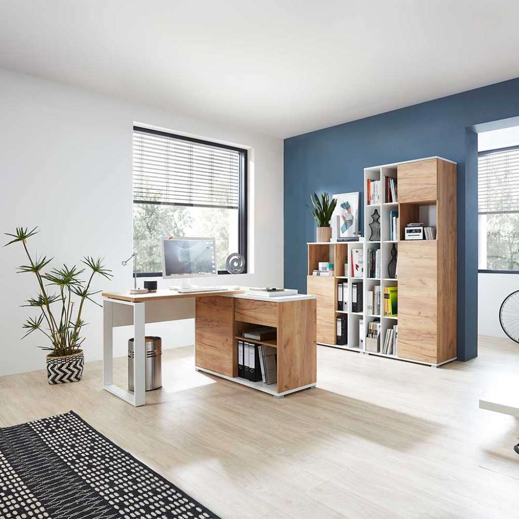 Allgemein - Büroausstattung Variable Büromöbel in Wildeichefarben und Weiß - Komplettbüro Hergestellt aus Spanplatte und Metall - Büromöbel set Modern - Büromöbel komplettset 3-teilige Kombination - Bürokombination Ohne Beleuchtung - Büromöbel sets Zerlegt, zum leichten Selbstaufbau (Montageanleitung liegt bei) - Arbeitszimmermöbel set Deutsche Produktion - Büromöbel-set Pflegeleichte Melaminharzbeschichtung in Weiß und in Holzoptik Wildeiche - Schränke stabil stehend auf vier Kunststofffüßen in Silberfarben und zwei Stützfüßen (zusätzliche Wandbefestigung wird zur Sicherheit empfohlen) - Funktionelles Design, ideal auch für kleinere Büros - Grifflos, Türen öffnen auf Gegendruck - Aktenschränke können seitenverkehrt montiert werden - Angesagter Farbkontrast - Bietet viel Stellfläche und sorgt für Ordnung im Arbeitszimmer - Ohne Dekoration und Zubehör Aktenschrank groß - Maße (BxHxT): je 85x197x40 cm - Zwei Türen mit hochwertigen Metallscharnieren - Hinter der großen Tür zwei Einlegeböden - Insgesamt 15 Fächer, davon vier hinter den Türen - Zwölf feste Böden, belastbar bis zu max. 10 kg, Oberboden belastbar bis zu 30 kg und Unterboden belastbar bis zu 15 kg Aktenschrank klein - Maße (BxHxT): 85x120x40 cm - Eine Tür mit hochwertigen Metallscharnieren - Hinter der Tür ein Einlegeboden, sieben offene Fächer - Sechs feste Böden (belastbar bis zu 10 kg), Oberboden (belastbar bis zu 30 kg) und Unterboden (belastbar bis zu 15 kg) Winkelschreibtisch - Maße (BxHxT): 120x75x117 cm - Ein Schubkasten auf Metallauszug (belastbar bis zu 5 kg), leichtes öffnen durch Kantenüberstand - Integriertes Sideboard mit vier Fächern (zwei feste Böden jeweils belastbar bis zu 10 kg) und einer Schiebetür, sodass zwei Fächer immer geschlossen und zwei offen sind - Platzsparende Ecklösung, auch seitenverkehrt aufstellbar - Einseitiges Metallbügelgestell in Weiß pulverbeschichtetet - Sideboard steht auf vier silbernen Kunststofffüßen und einem zuätzlichen Stützfuß (Oberboden und Unterboden jeweils bis zu 15 kg belastbar) - Arbeitsfläche aus Spanplatte (belastbar bis zu 25 kg)Informationen zur Lieferung:Die Zustellung dieses Produktes erfolgt per Spedition. Sie werden vor der Auslieferung durch die ausliefernde Spedition kontaktiert.Terminvereinbarung: Sie werden frühzeitig (ein paar Tage im Voraus) durch die ausliefernde Spedition kontaktiert und Ihnen der Auslieferzeitpunkt mitgeteilt. Die Kontaktaufnahme erfolgt per Telefon. Bei telefonischer Nichterreichbarkeit werden Sie per Postkarte über das Auslieferdatum informiert.Die Lieferung erfolgt aus Kostengründen Frei Bordsteinkante (bis zur ersten verschlossenen Tür). Für den weiteren Transport der Ware sind Sie eigenverantwortlich.Die Auslieferung erfolgt von Montags bis Freitags. Eine Zustellung an Sonn- und Feiertagen ist nicht möglich.
