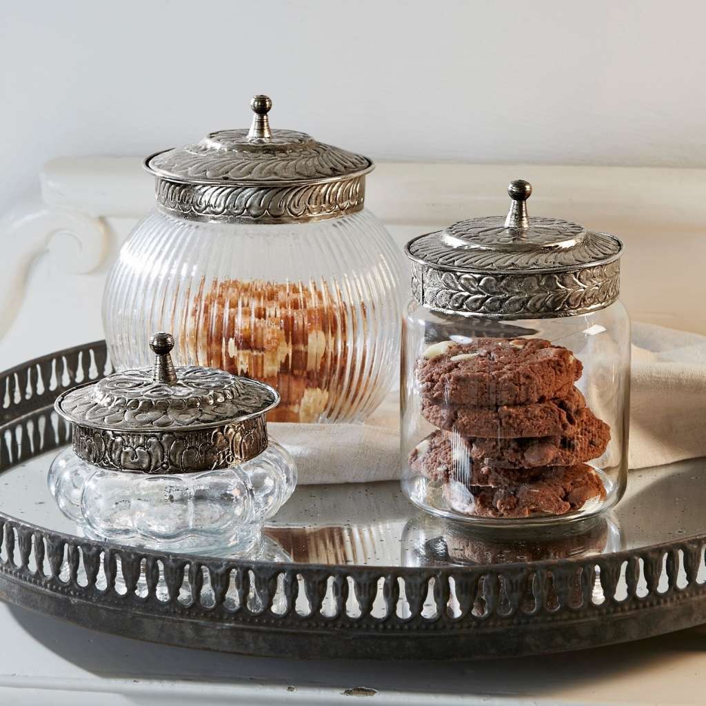 Drei wunderschöne Schätze mit feinem Vintage-Charakter. Aus Glas mit kunstvoll gearbeiteten Deckeln aus Eisen. Sehr individuell einsetzbar und ausgesprochen […]