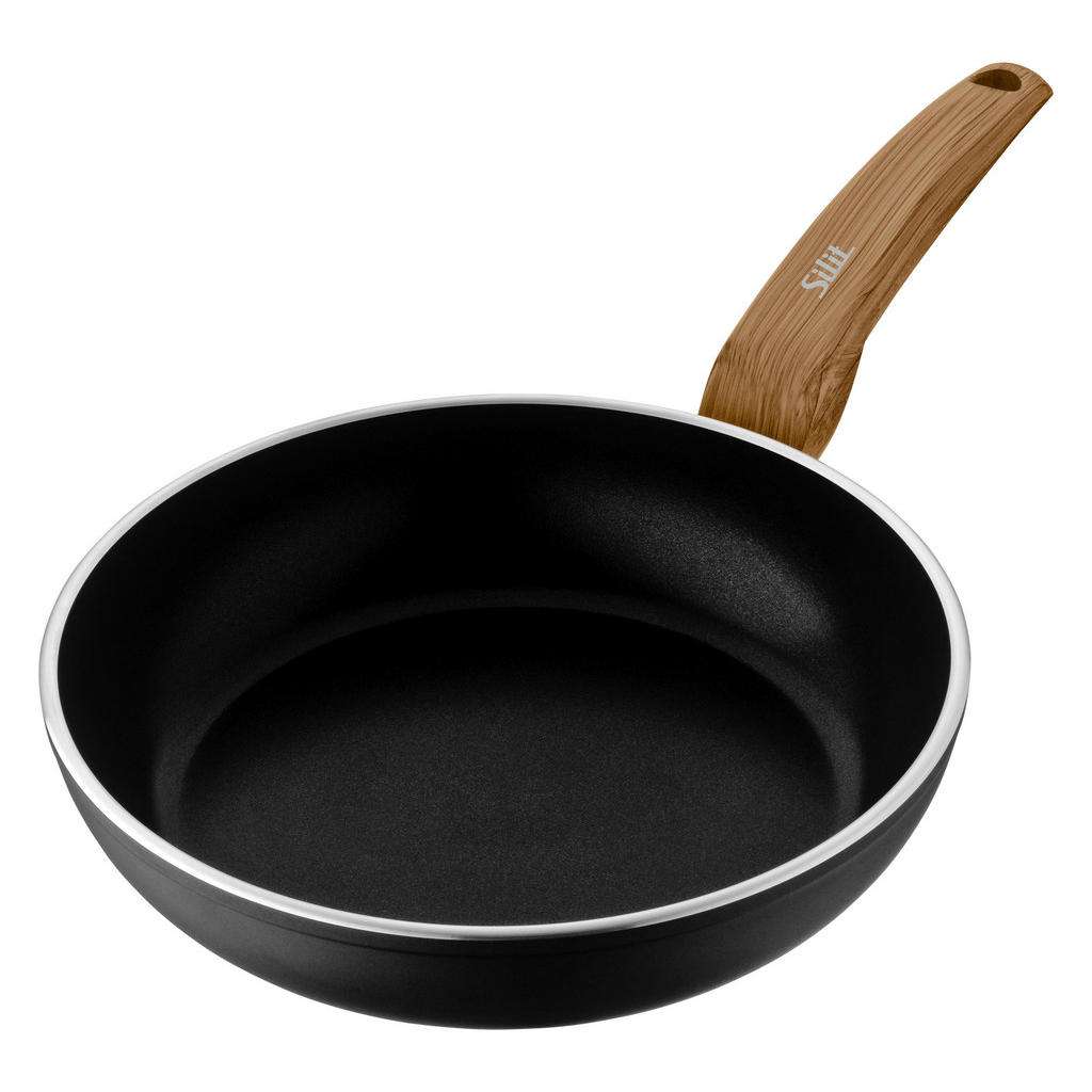 Mit der SILIT Pfanne 'Faggo' (Durchmesser: ca. 24 cm) setzen Sie einen neuen Trend in Ihrer Küche: Als Kontrast zum schwarzen Aluminium ist der Kunststoffgriff in chicen Holzfarben ein moderner Eyecatcher und begeistert dabei zusätzlich durch seine ergonomische Form. Einen glänzenden Akzent bildet der alufarbene Rand. Dabei ist die Pfanne für alle Herdarten geeignet und überzeugt durch ihre exzellente Antihaftwirkung. Die hochwertige Silitan®-Antihaftbeschichtung lässt ein schonendes Braten auch von empfindlichen Mehl- und Eierspeisen beziehungsweise Gemüse zu. Praktisch: Die Pfanne ist bis ca. 70° C backofengeeignet, sodass Sie Ihre kulinarischen Kreationen dort warmstellen oder nachgaren lassen können. Die SILIT Pfanne 'Faggo' (Durchmesser: ca. 24 cm) kombiniert Koch-Komfort mit Style!