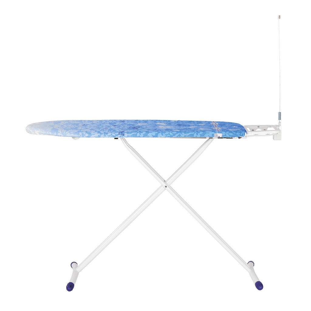 Ihr neues Bügelbrett 'Airsteam M Express' überzeugt mit bewährter LEIFHEIT Markenqualität. Das belastbare Board besteht aus einem standsicheren Rundrohr-Untergestell sowie einer Bügelfläche aus Streckmetall und beständigem Kunststoff. Darüber wurde ein Bezug aus 100 % Baumwolle gespannt. Der Stoff überzeugt nicht nur mit dem charmanten Schmetterlingsmuster in Blau, sondern gewährleistet auch optimale Aufnahme von Feuchtigkeit. Somit eignet sich das Bügelbrett ideal für den Einsatz einer modernen Dampfstation. Für rückenfreundliches Arbeiten passt sich das Brett Ihrer Körpergröße an. Dabei ist eine Höhe bis zu ca. 98 cm möglich. Eine sichere Ablage mit praktischer Mulde hält sowohl Bügeleisen als auch Dampfstationen immer griffbereit. Zudem hält ein Kabelhalter das Stromkabel bei Bewegung zurück und erleichtert Ihnen so die Arbeit zusätzlich. Auf der Fläche von ca. 38 x 120 cm bekommen Sie auch große Wäschestücke wie Kissenbezüge oder Arbeitsanzüge knitterfrei. Erleichtern Sie sich das Bügeln mit einem hochwertigen und multifunktionalen Bügelbrett von LEIFHEIT!