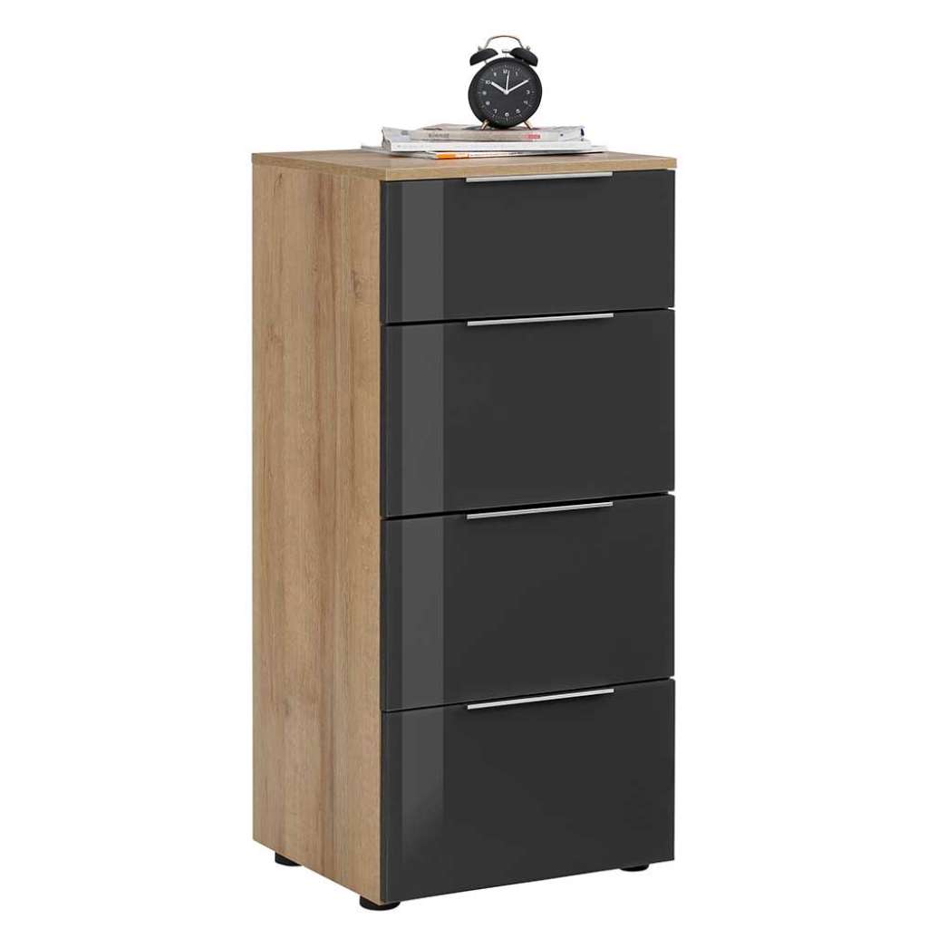 Hohe Kommode in Anthrazit Glas beschichtet Eichefarben