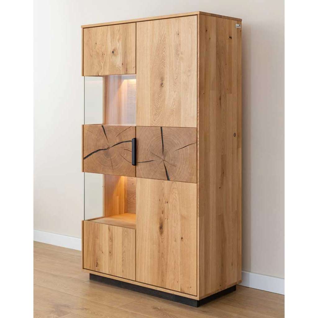 Highboard Vitrine mit LED Beleuchtung und Glastür - Mit Sockelgestell aus Massivholz - Mit acht Einlegeböden - 2 türig mit gedämpften Metallbeschlägen, Innenaufteilung: Mit Einlegeböden - Mit Metallgriffen - Für Energieeffizienzklasse LED - Mit LED Beleuchtung - Vitrine mit Stauraum in modernem Design - Fertig montierte Anlieferung (eventuell müssen noch Kleinteile angebracht werden) - Mit Massivholz Oberfläche geölt - Esszimmerschrank in Eichefarben - Kommode aus Eiche Massivholz - Highbord 83 cm Breit, 147 cm Hoch, 39 cm TiefInformationen zur Lieferung:Der Versand dieses Artikels erfolgt per DHL-Superservice. Dieses beinhaltet folgenden Service für Sie:Terminvereinbarung: Sie werden frühzeitig (ein paar Tage im Voraus) durch die ausliefernde Spedition kontaktiert und Ihnen der Auslieferzeitpunkt mitgeteilt. Die Kontaktaufnahme erfolgt per Telefon. Bei telefonischer Nichterreichbarkeit werden Sie per Postkarte über das Auslieferdatum informiert.Lieferung Frei Verwendungsstelle: Der Transport erfolgt an Ort und Stelle. Sie bestimmen, wohin Sie die Ware getragen haben möchten. Ob Dachgeschoss, Erdgeschoss, Schlaf- oder Wohnzimmer - die Ware wird an den von Ihnen gewünschten Ort vertragen.Zwei Speditionsfahrer vertragen die Ware: keine Mithilfe beim Entladen und Vertragen der Ware nötig. Die Speditionsfahrer sind auf den Möbeltransport spezialisiert und entsprechend geschult, somit sind Transportreklamationen nahezu ausgeschlossen.Die Auslieferung erfolgt von Montags bis Freitags. Eine Zustellung an Sonn- und Feiertagen ist nicht möglich.Alle aufgeführten Serviceleistungen sind im Artikelpreis enthalten. Es fallen keine weiteren Kosten für Sie an. Bei Insellieferungen kann nur ein reiner Abgabeservice angeboten werden - das Vertragen der Ware + Verpackungsentsorgung entfällt hierbei.