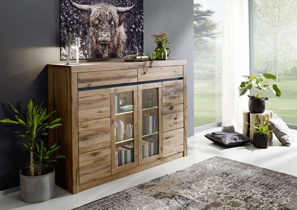 - Holz-Mix aus Wild- und urwüchsiger Zerr-Eiche - Soft-Close-System für Türen und Schubladen - auffälliges Farbspiel (hell über rötlich bis dunkel bzw. schwarz) - puristisches griffloses Design - starke Riss-Optik - erhältlich in 3 Farbe, Natur, Maße: L:170cm x B:45cm x H:125cm