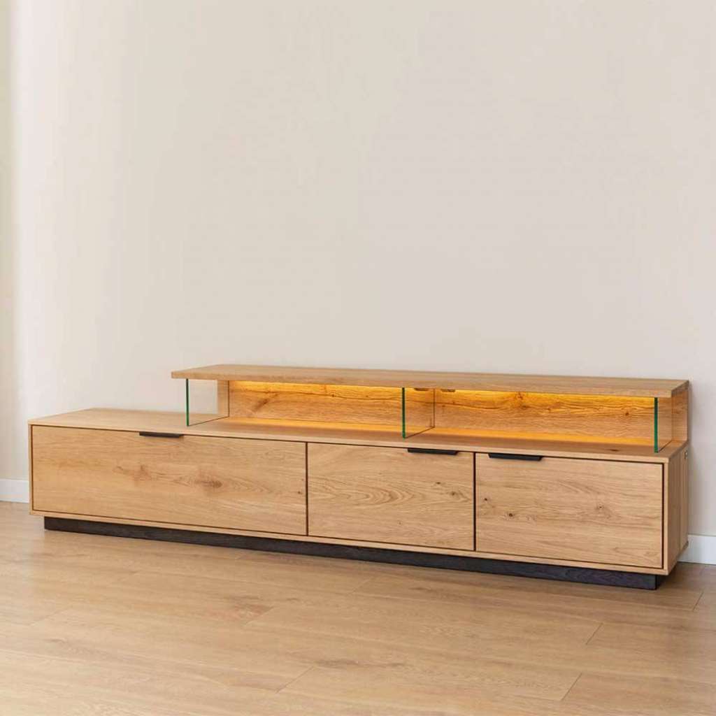 TV Lowboard Fernsehboard mit LED Beleuchtung und Türen - Mit Sockelgestell aus Massivholz - Mit großen Staufächern hinter den Türen - Tv-tisch 2 türig mit gedämpften Metallbeschlägen - Mit offenem Gerätefach - TV Bank in modernem Design - Mit Metallgriffen - Fertig montierte Anlieferung (eventuell müssen noch Kleinteile angebracht werden) - Mit Massivholz Oberfläche geölt - Sideboard für TV in Eichefarben - Für Energieeffizienzklasse LED - Mit LED Beleuchtung - Fernsehschrank aus Eiche Massivholz - Zwei Kabeldurchlässe in der Rückwand - Tv-board 200 cm Breit, 52 cm Hoch, 39 cm TiefInformationen zur Lieferung:Der Versand dieses Artikels erfolgt per DHL-Superservice. Dieses beinhaltet folgenden Service für Sie:Terminvereinbarung: Sie werden frühzeitig (ein paar Tage im Voraus) durch die ausliefernde Spedition kontaktiert und Ihnen der Auslieferzeitpunkt mitgeteilt. Die Kontaktaufnahme erfolgt per Telefon. Bei telefonischer Nichterreichbarkeit werden Sie per Postkarte über das Auslieferdatum informiert.Lieferung Frei Verwendungsstelle: Der Transport erfolgt an Ort und Stelle. Sie bestimmen, wohin Sie die Ware getragen haben möchten. Ob Dachgeschoss, Erdgeschoss, Schlaf- oder Wohnzimmer - die Ware wird an den von Ihnen gewünschten Ort vertragen.Zwei Speditionsfahrer vertragen die Ware: keine Mithilfe beim Entladen und Vertragen der Ware nötig. Die Speditionsfahrer sind auf den Möbeltransport spezialisiert und entsprechend geschult, somit sind Transportreklamationen nahezu ausgeschlossen.Die Auslieferung erfolgt von Montags bis Freitags. Eine Zustellung an Sonn- und Feiertagen ist nicht möglich.Alle aufgeführten Serviceleistungen sind im Artikelpreis enthalten. Es fallen keine weiteren Kosten für Sie an. Bei Insellieferungen kann nur ein reiner Abgabeservice angeboten werden - das Vertragen der Ware + Verpackungsentsorgung entfällt hierbei.