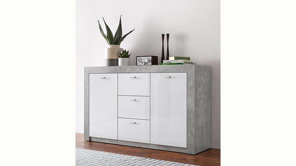 In folgenden Farben erhältlich: Korpus/Front: Beton-Optik matt/weiß Hochglanz. Korpus/Front: antikweiß gewischt. Details: 2 Holztüren. Fachinnenmaße (B/T/H): ca. 40,5/37/36,5 cm. Fachinnenmaße (B/T/H): ca. 40,5/37/35 cm. Türanschlag rechts. Türanschlag links. 3 Schubkästen. Schubkasteninnenmaße (B/T/H): ca. 36,5/31,5/12,5 cm. 2 verstellbare Holzböden. Hochglanz. Dekorative Rahmenoptik. FSC®-zertifizierter Holzwerkstoff. Pflegeleichte Oberflächen. Ideal für kleine Räume. In verschiedenen Farben. Maße: Maße (B/T/H): ca. 145,5/40,5/89 cm. Alles ca.-Maße. Informationen zu Lieferumfang und Montage: Mit Aufbauanleitung. Material: Korpus: Holzwerkstoff. Front: Holzwerkstoff. Front: melaminbeschichtet. FSC®-zertifizierter Holzwerkstoff. Griffe aus Kunststoff. Scharniere aus Metall. Schubkästen auf Metallauszug. Holzwerkstoff. Pflegehinweise: Pflegehinweise für Möbel aus Holzwerkstoffen (inklusive Melamin und MDF): Verwenden Sie zur Pflege Ihrer Möbel aus Plattenwerkstoffen am besten ein weiches, nicht fusselndes Tuch oder ein Ledertuch. Wischen Sie die Oberflächen leicht feucht ab. FSC®-zertifizierter Holzwerkstoff: Das Label des FSC® weist nach, dass Sie mit dem Kauf dieser Produkte vorbildlich Waldwirtschaft - nach den strengen ökologischen, sozialen und wirtschaftlichen Standards des Forest Stewardship Council® - fördern und die Waldressourcen schonen.
