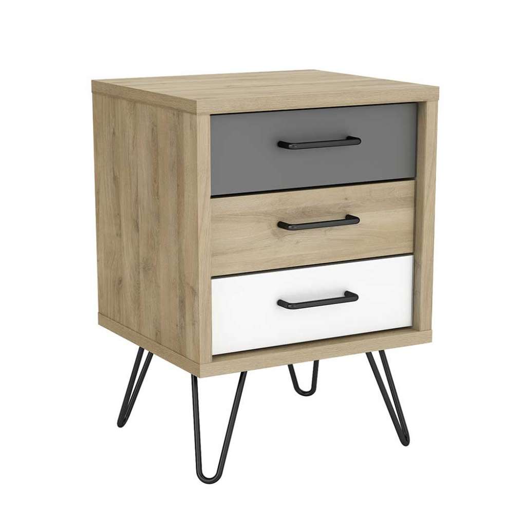 Nachttisch Kommode in Eichefarben Grau und Weiß Vierfußgestell aus Metall