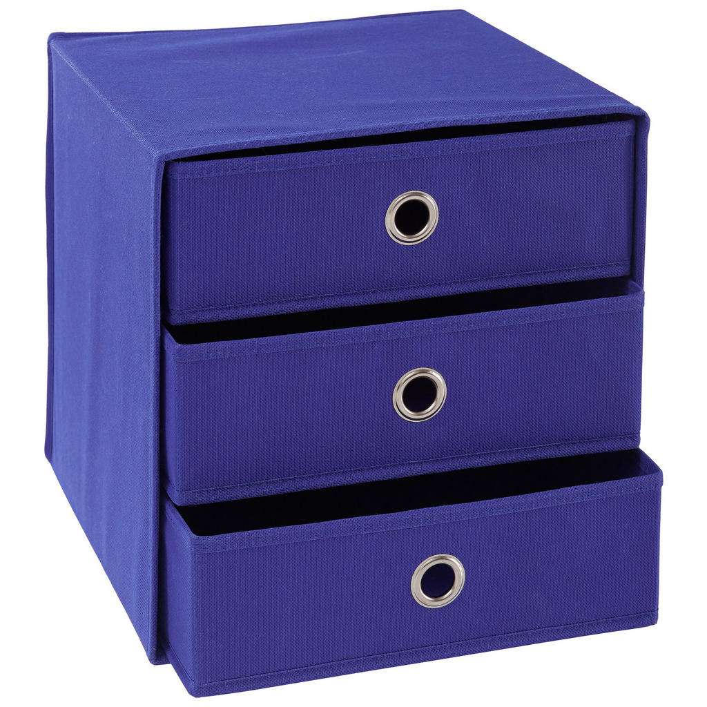 Diese Faltbox in Blau mit Schubladen schafft Ordnung im Homeoffice oder Jugendzimmer. Die Aufbewahrungsbox (ca. 32 x 32 x 32 cm) beweist vielfältige Einsatzmöglichkeiten, ob neben dem Bett oder im Regal. Die 3 Fächer lassen sich jeweils bequem am Griffloch mit Metallöse hervorziehen. Hier kommen Ladekabel, Snacks und Stifte unter. Mit der kräftigen Farbgebung in Blau entsteht zugleich ein moderner Look. Der Organizer aus Textil mit Vliesstoff-Oberfläche erweist sich im Alltag als robust. Mit dieser Faltbox in Blau mit Schubladen macht das Aufräumen Spaß!