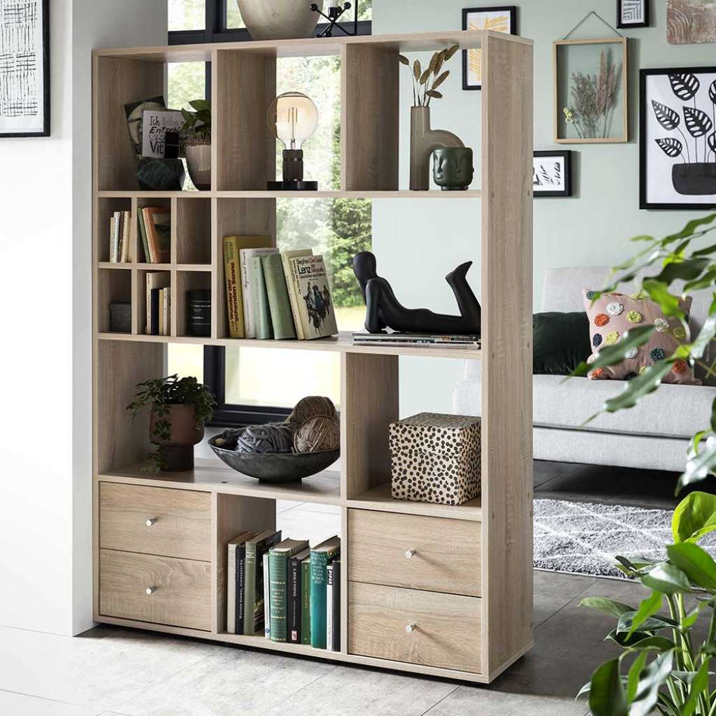 Esszimmerregal in Sonoma-Eiche vier Schubladen - Raumteiler 105 cm Breit, 142 cm Hoch, 29 cm Tief - Mit vier Schubladen auf Metallauszug - Buchregal in Sonoma-Eiche - Melaminbeschichtet - Aus deutscher Produktion - Raumtrenner aus Spanplatte - Standregal in modernem Design - Zerlegt, zum leichten Selbstaufbau (Montageanleitung liegt bei) - In rechteckiger FormInformationen zur Lieferung:Der Versand dieses Artikels erfolgt per DHL Paketdienst (Deutsche Post). Sollten Sie bei der Erstzustellung nicht angetroffen werden, hinterläßt der Zusteller in Ihrem Briefkasten eine Benachrichtigungskarte. Sie können die Ware dann in Ihrer Postfiliale vor Ort abholen. Die Auslieferung erfolgt von Montags bis Samstags. Eine Zustellung an Sonn- und Feiertagen ist nicht möglich.