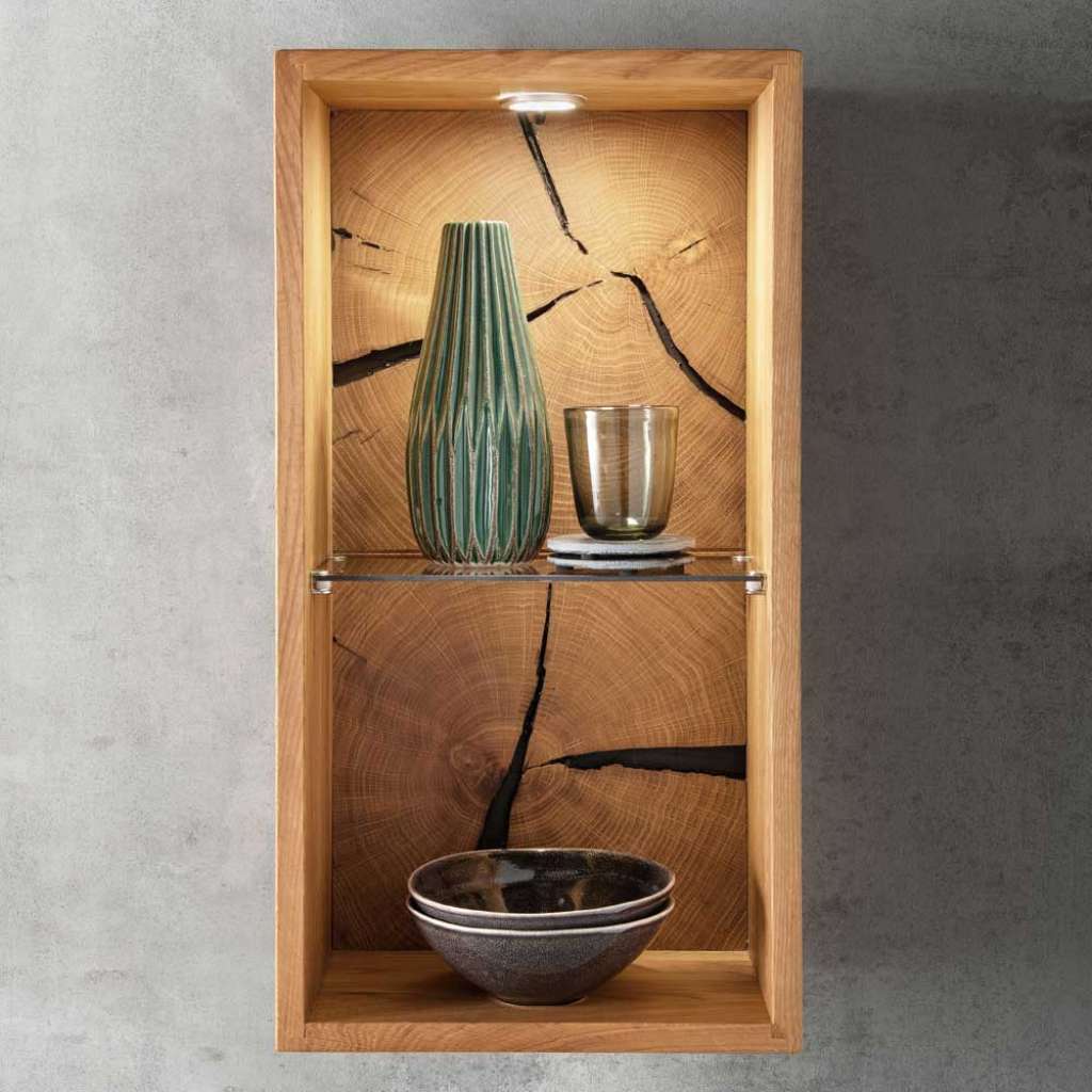 Hängeregal Wildeiche geölt mit Hirnholz Rückwand ein Glasboden