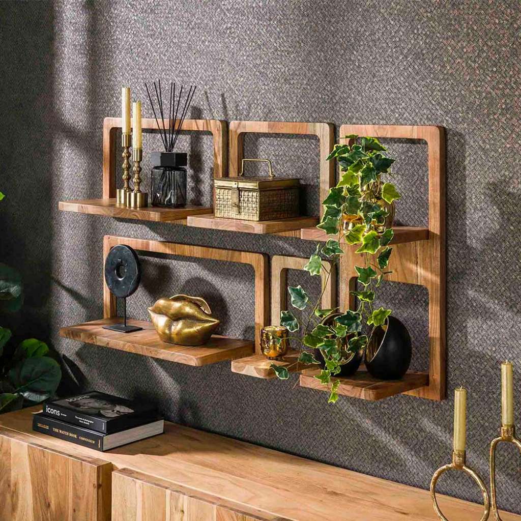 Wandregal Hängeregal aus Akazie Massivholz in Akaziefarben (fünfteilig)