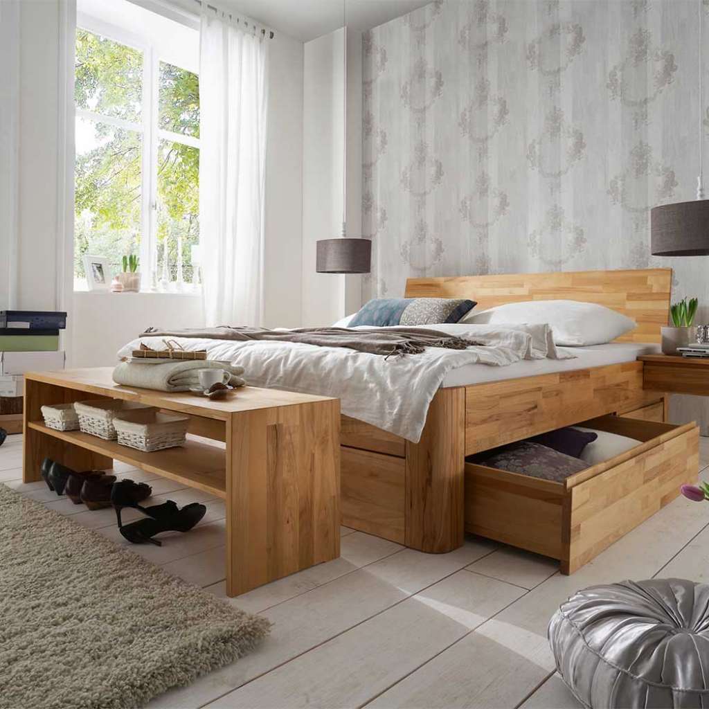 Schlafzimmermöbel Kernbuche aus Massivholz geölt (zweiteilig) - Zweiteilig - Zerlegt, zum leichten Selbstaufbau (Montageanleitung liegt bei) - In modernem Design - Inklusive Sitzbank - Breite Variante ist mind. benötigte Gesamtfläche, Einzelmaße sind unten separat aufgeführt - Mit Massivholz Oberfläche geölt - Inklusive Bettkasten - Aus Kernbuche Massivholz - In Kernbuchefarben - Schlafzimmer komplett 93 cm Hoch, 215 cm TiefVarianten - 001: Breite: 145 / mit einer Liegefläche von 140x200 - 002: Breite: 165 / mit einer Liegefläche von 160x200 - 003: Breite: 185 / mit einer Liegefläche von 180x200 - 004: Breite: 205 / mit einer Liegefläche von 200x200Informationen zur Lieferung:Der Versand dieses Artikels erfolgt per DHL-Superservice. Dieses beinhaltet folgenden Service für Sie:Terminvereinbarung: Sie werden frühzeitig (ein paar Tage im Voraus) durch die ausliefernde Spedition kontaktiert und Ihnen der Auslieferzeitpunkt mitgeteilt. Die Kontaktaufnahme erfolgt per Telefon. Bei telefonischer Nichterreichbarkeit werden Sie per Postkarte über das Auslieferdatum informiert.Lieferung Frei Verwendungsstelle: Der Transport erfolgt an Ort und Stelle. Sie bestimmen, wohin Sie die Ware getragen haben möchten. Ob Dachgeschoss, Erdgeschoss, Schlaf- oder Wohnzimmer - die Ware wird an den von Ihnen gewünschten Ort vertragen.Zwei Speditionsfahrer vertragen die Ware: keine Mithilfe beim Entladen und Vertragen der Ware nötig. Die Speditionsfahrer sind auf den Möbeltransport spezialisiert und entsprechend geschult, somit sind Transportreklamationen nahezu ausgeschlossen.Die Auslieferung erfolgt von Montags bis Freitags. Eine Zustellung an Sonn- und Feiertagen ist nicht möglich.Alle aufgeführten Serviceleistungen sind im Artikelpreis enthalten. Es fallen keine weiteren Kosten für Sie an. Bei Insellieferungen kann nur ein reiner Abgabeservice angeboten werden - das Vertragen der Ware + Verpackungsentsorgung entfällt hierbei.