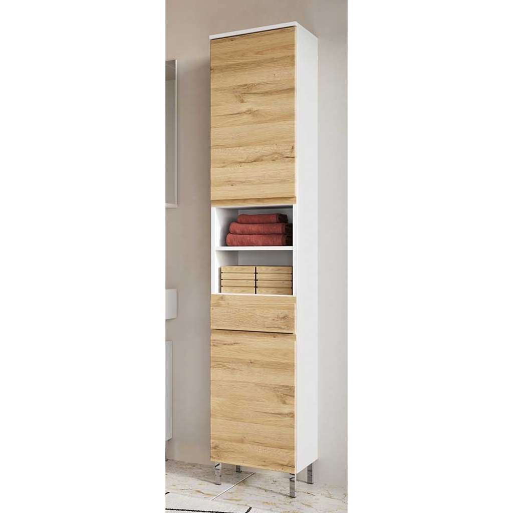 Moderner Bad Hochschrank Made in Germany stoßfesten ABS Kanten - 2 türig mit Türdämpfung, Innenaufteilung: Mit Einlegeböden - Mit drei Einlegeböden je Facheinheit - Zerlegt, zum leichten Selbstaufbau (Montageanleitung liegt bei) - In modernem Design - Aus deutscher Produktion - Aus MDF und Spanplatte - Mit Türen wahlweise rechts und links montierbar - In Wildeichefarben und Weiß - Melaminbeschichtet, foliert und Dekor tiefgezogen - Mit Griffmulden - Mit einer Schublade mit Soft Close, Selbsteinzug und auf Metallauszug - Mit stoßfesten ABS Kanten - Badschrank-midischrank 34 cm Breit, 190 cm Hoch, 34 cm TiefInformationen zur Lieferung:Die Zustellung dieses Produktes erfolgt per DPD. Sollten Sie bei der Erstzustellung nicht angetroffen werden, hinterlässt der Zusteller in Ihrem Briefkasten eine Benachrichtigungskarte mit dem zweiten Liefertermin, den Lieferdaten sowie Kontaktinformationen. Somit haben Sie die Möglichkeit, sich bezüglich des Empfangs Ihrer Ware mit DPD in Verbindung zu setzen. Die Zustellung erfolgt maximal 3x, sofern die beiden ersten Termine erfolglos bleiben sollten. Die Auslieferung erfolgt von Montags bis Freitags. Eine Zustellung an Sonn- und Feiertagen ist nicht möglich.