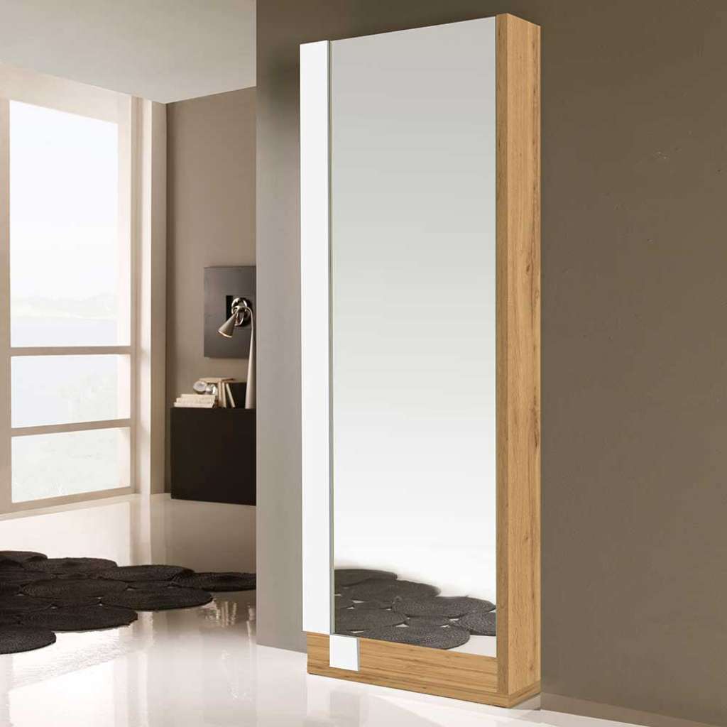 Spiegelschuhschrank in Weiß Hochglanz und Wildeiche Optik 70 cm breit