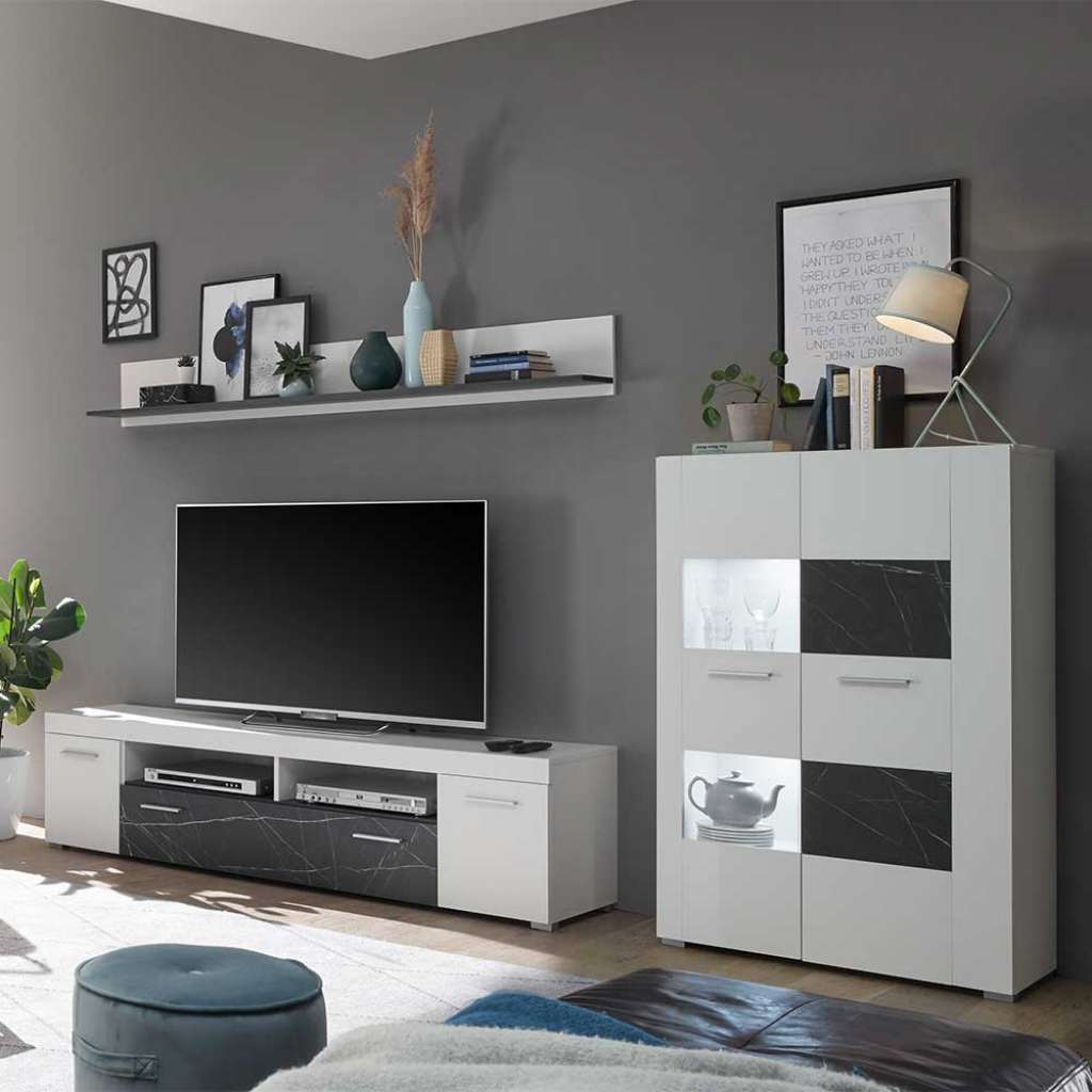 (dreiteilig) - Schrankwand Wohnzimmer 260 cm Breit, 123 cm Hoch, 40 cm Tief - Wohnwand in Weiß und Anthrazit - Melaminbeschichtet - Anbauwand aus Spanplatte - Mit Metallgriffen - In modernem Design - Zerlegt, zum leichten Selbstaufbau (Montageanleitung liegt bei) - Dreiteilig - Mit Kabeldurchlass an der RückwandVarianten - 001: Standardausführung - 002: mit LED Beleuchtung / für Energieeffizienzklasse LEDInformationen zur Lieferung:Der Versand dieses Artikels erfolgt per DHL-Superservice. Dieses beinhaltet folgenden Service für Sie:Terminvereinbarung: Sie werden frühzeitig (ein paar Tage im Voraus) durch die ausliefernde Spedition kontaktiert und Ihnen der Auslieferzeitpunkt mitgeteilt. Die Kontaktaufnahme erfolgt per Telefon. Bei telefonischer Nichterreichbarkeit werden Sie per Postkarte über das Auslieferdatum informiert.Lieferung Frei Verwendungsstelle: Der Transport erfolgt an Ort und Stelle. Sie bestimmen, wohin Sie die Ware getragen haben möchten. Ob Dachgeschoss, Erdgeschoss, Schlaf- oder Wohnzimmer - die Ware wird an den von Ihnen gewünschten Ort vertragen.Zwei Speditionsfahrer vertragen die Ware: keine Mithilfe beim Entladen und Vertragen der Ware nötig. Die Speditionsfahrer sind auf den Möbeltransport spezialisiert und entsprechend geschult, somit sind Transportreklamationen nahezu ausgeschlossen.Die Auslieferung erfolgt von Montags bis Freitags. Eine Zustellung an Sonn- und Feiertagen ist nicht möglich.Alle aufgeführten Serviceleistungen sind im Artikelpreis enthalten. Es fallen keine weiteren Kosten für Sie an. Bei Insellieferungen kann nur ein reiner Abgabeservice angeboten werden - das Vertragen der Ware + Verpackungsentsorgung entfällt hierbei.