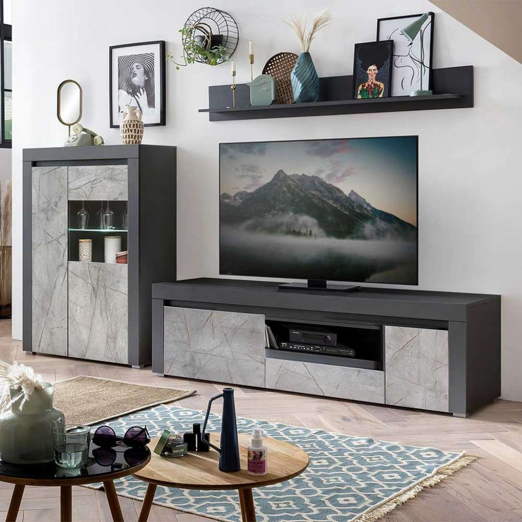 (dreiteilig) - Wohnzimmerschrankwand 275 cm Breit, 130 cm Hoch, 50 cm Tief - TV Wohnwand in Grau und Anthrazit - Melaminbeschichtet - Anbauwand aus Spanplatte - In modernem Design - Zerlegt, zum leichten Selbstaufbau (Montageanleitung liegt bei) - Dreiteilig - Mit Kabeldurchlass an der RückwandVarianten - 001: Standardausführung - 002: mit LED Beleuchtung / für Energieeffizienzklasse LEDInformationen zur Lieferung:Der Versand dieses Artikels erfolgt per DHL-Superservice. Dieses beinhaltet folgenden Service für Sie:Terminvereinbarung: Sie werden frühzeitig (ein paar Tage im Voraus) durch die ausliefernde Spedition kontaktiert und Ihnen der Auslieferzeitpunkt mitgeteilt. Die Kontaktaufnahme erfolgt per Telefon. Bei telefonischer Nichterreichbarkeit werden Sie per Postkarte über das Auslieferdatum informiert.Lieferung Frei Verwendungsstelle: Der Transport erfolgt an Ort und Stelle. Sie bestimmen, wohin Sie die Ware getragen haben möchten. Ob Dachgeschoss, Erdgeschoss, Schlaf- oder Wohnzimmer - die Ware wird an den von Ihnen gewünschten Ort vertragen.Zwei Speditionsfahrer vertragen die Ware: keine Mithilfe beim Entladen und Vertragen der Ware nötig. Die Speditionsfahrer sind auf den Möbeltransport spezialisiert und entsprechend geschult, somit sind Transportreklamationen nahezu ausgeschlossen.Die Auslieferung erfolgt von Montags bis Freitags. Eine Zustellung an Sonn- und Feiertagen ist nicht möglich.Alle aufgeführten Serviceleistungen sind im Artikelpreis enthalten. Es fallen keine weiteren Kosten für Sie an. Bei Insellieferungen kann nur ein reiner Abgabeservice angeboten werden - das Vertragen der Ware + Verpackungsentsorgung entfällt hierbei.
