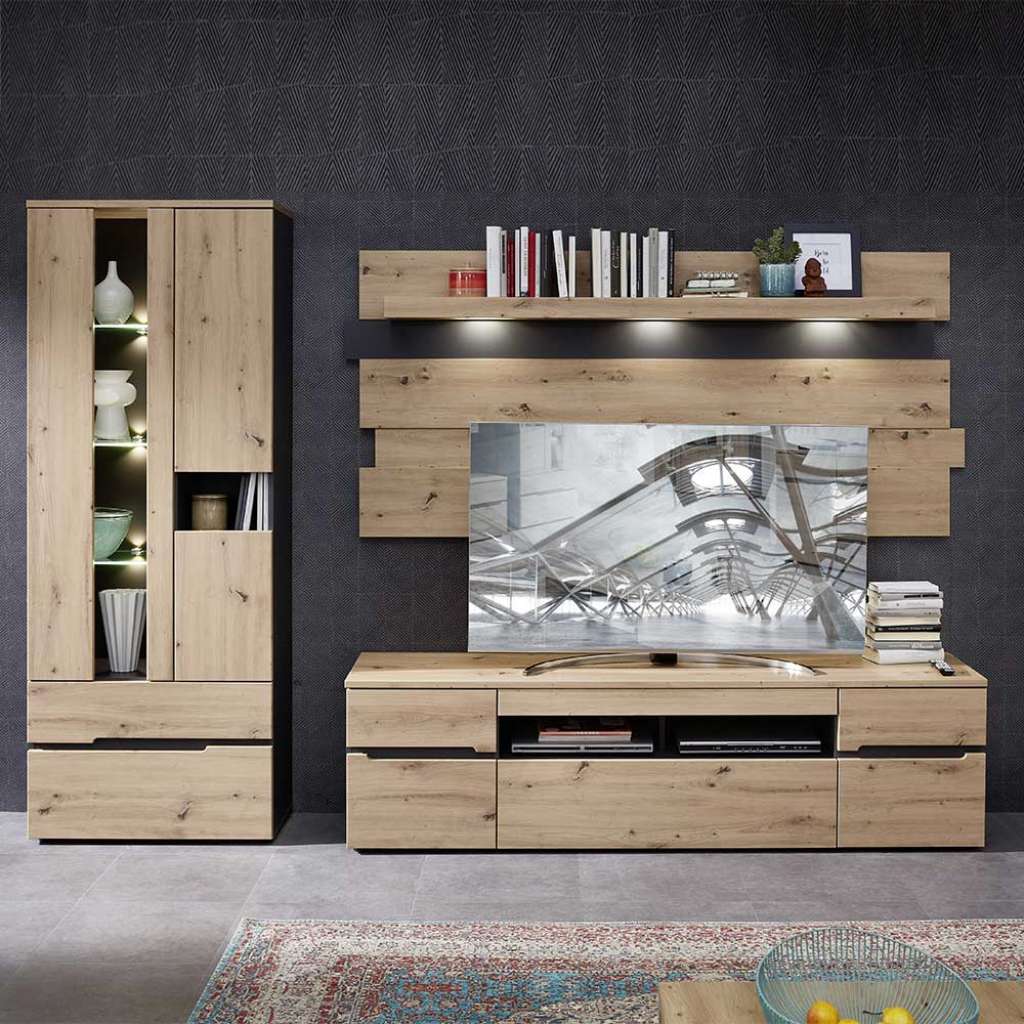 (dreiteilig) - Mit Kabeldurchlass an der Rückwand - Dreiteilig - Zerlegt, zum leichten Selbstaufbau (Montageanleitung liegt bei) - In modernem Design - Für Energieeffizienzklasse LED - Mit LED Beleuchtung - Anbauwand aus MDF - Foliert - Wohnwand modern in Wildeichefarben und Dunkelgrau - Mit Griffmulden - Wohnzimmerschrankwand 267 cm Breit, 197 cm Hoch, 47 cm TiefInformationen zur Lieferung:Der Versand dieses Artikels erfolgt per DHL-Superservice. Dieses beinhaltet folgenden Service für Sie:Terminvereinbarung: Sie werden frühzeitig (ein paar Tage im Voraus) durch die ausliefernde Spedition kontaktiert und Ihnen der Auslieferzeitpunkt mitgeteilt. Die Kontaktaufnahme erfolgt per Telefon. Bei telefonischer Nichterreichbarkeit werden Sie per Postkarte über das Auslieferdatum informiert.Lieferung Frei Verwendungsstelle: Der Transport erfolgt an Ort und Stelle. Sie bestimmen, wohin Sie die Ware getragen haben möchten. Ob Dachgeschoss, Erdgeschoss, Schlaf- oder Wohnzimmer - die Ware wird an den von Ihnen gewünschten Ort vertragen.Zwei Speditionsfahrer vertragen die Ware: keine Mithilfe beim Entladen und Vertragen der Ware nötig. Die Speditionsfahrer sind auf den Möbeltransport spezialisiert und entsprechend geschult, somit sind Transportreklamationen nahezu ausgeschlossen.Die Auslieferung erfolgt von Montags bis Freitags. Eine Zustellung an Sonn- und Feiertagen ist nicht möglich.Alle aufgeführten Serviceleistungen sind im Artikelpreis enthalten. Es fallen keine weiteren Kosten für Sie an. Bei Insellieferungen kann nur ein reiner Abgabeservice angeboten werden - das Vertragen der Ware + Verpackungsentsorgung entfällt hierbei.