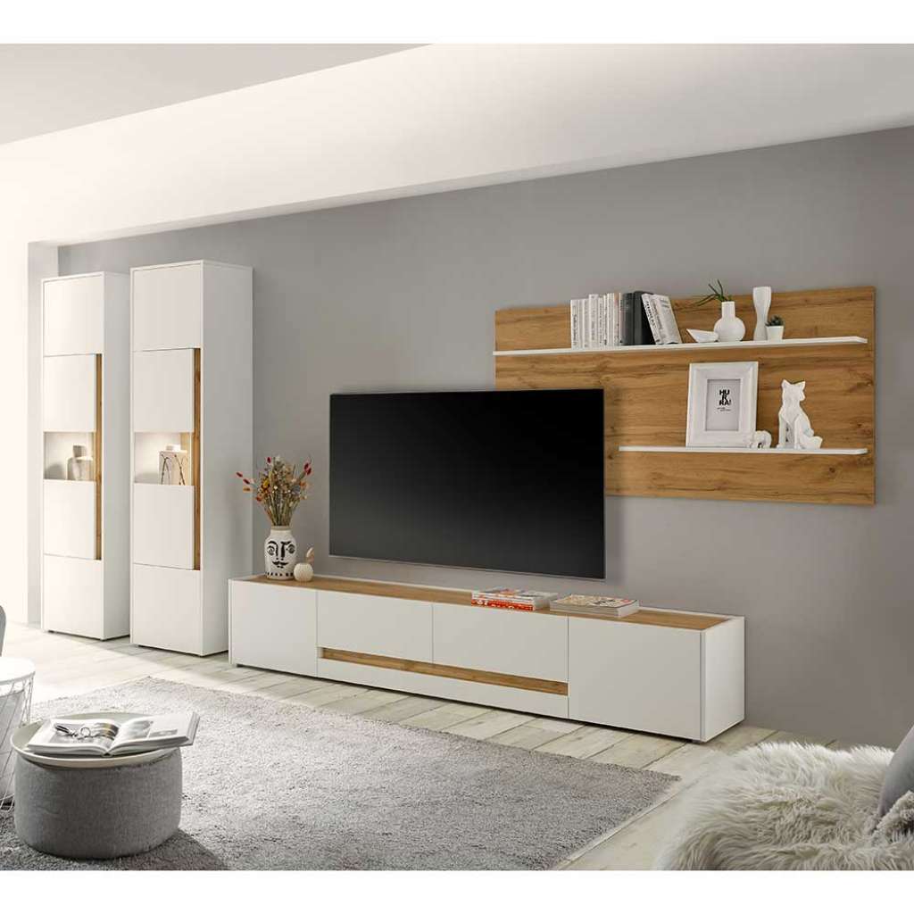 (vierteilig) - Fernseher schrankwand 320 cm Breit, 197 cm Hoch, 45 cm Tief - Mit Griffmulden - TV Wohnwand in Weiß und Wildeichefarben - Melaminbeschichtet - Anbauwand aus Spanplatte - In modernem Design - Zerlegt, zum leichten Selbstaufbau (Montageanleitung liegt bei) - Vierteilig - Mit Türen wahlweise rechts und links montierbarVarianten - 001: Standardausführung - 002: mit LED Beleuchtung / für Energieeffizienzklasse LEDInformationen zur Lieferung:Der Versand dieses Artikels erfolgt per DHL-Superservice. Dieses beinhaltet folgenden Service für Sie:Terminvereinbarung: Sie werden frühzeitig (ein paar Tage im Voraus) durch die ausliefernde Spedition kontaktiert und Ihnen der Auslieferzeitpunkt mitgeteilt. Die Kontaktaufnahme erfolgt per Telefon. Bei telefonischer Nichterreichbarkeit werden Sie per Postkarte über das Auslieferdatum informiert.Lieferung Frei Verwendungsstelle: Der Transport erfolgt an Ort und Stelle. Sie bestimmen, wohin Sie die Ware getragen haben möchten. Ob Dachgeschoss, Erdgeschoss, Schlaf- oder Wohnzimmer - die Ware wird an den von Ihnen gewünschten Ort vertragen.Zwei Speditionsfahrer vertragen die Ware: keine Mithilfe beim Entladen und Vertragen der Ware nötig. Die Speditionsfahrer sind auf den Möbeltransport spezialisiert und entsprechend geschult, somit sind Transportreklamationen nahezu ausgeschlossen.Die Auslieferung erfolgt von Montags bis Freitags. Eine Zustellung an Sonn- und Feiertagen ist nicht möglich.Alle aufgeführten Serviceleistungen sind im Artikelpreis enthalten. Es fallen keine weiteren Kosten für Sie an. Bei Insellieferungen kann nur ein reiner Abgabeservice angeboten werden - das Vertragen der Ware + Verpackungsentsorgung entfällt hierbei.
