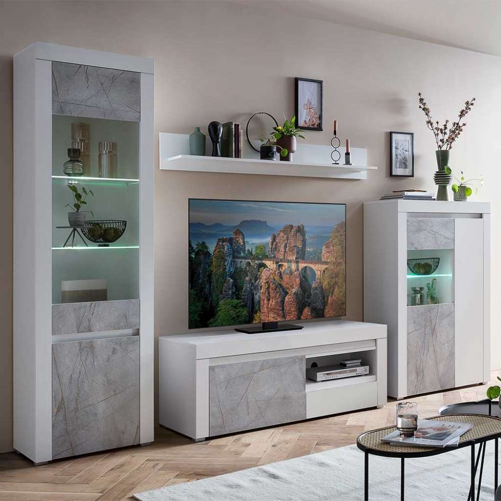(vierteilig) - Schrankwand Wohnzimmer 299 cm Breit, 200 cm Hoch, 50 cm Tief - Designer Wohnwand in Weiß und Grau - Mit Türen wahlweise rechts und links montierbar - Melaminbeschichtet - Anbauwand aus Spanplatte - In modernem Design - Zerlegt, zum leichten Selbstaufbau (Montageanleitung liegt bei) - Vierteilig - Mit Kabeldurchlass an der RückwandVarianten - 001: Standardausführung - 002: mit LED Beleuchtung / für Energieeffizienzklasse LEDInformationen zur Lieferung:Der Versand dieses Artikels erfolgt per DHL-Superservice. Dieses beinhaltet folgenden Service für Sie:Terminvereinbarung: Sie werden frühzeitig (ein paar Tage im Voraus) durch die ausliefernde Spedition kontaktiert und Ihnen der Auslieferzeitpunkt mitgeteilt. Die Kontaktaufnahme erfolgt per Telefon. Bei telefonischer Nichterreichbarkeit werden Sie per Postkarte über das Auslieferdatum informiert.Lieferung Frei Verwendungsstelle: Der Transport erfolgt an Ort und Stelle. Sie bestimmen, wohin Sie die Ware getragen haben möchten. Ob Dachgeschoss, Erdgeschoss, Schlaf- oder Wohnzimmer - die Ware wird an den von Ihnen gewünschten Ort vertragen.Zwei Speditionsfahrer vertragen die Ware: keine Mithilfe beim Entladen und Vertragen der Ware nötig. Die Speditionsfahrer sind auf den Möbeltransport spezialisiert und entsprechend geschult, somit sind Transportreklamationen nahezu ausgeschlossen.Die Auslieferung erfolgt von Montags bis Freitags. Eine Zustellung an Sonn- und Feiertagen ist nicht möglich.Alle aufgeführten Serviceleistungen sind im Artikelpreis enthalten. Es fallen keine weiteren Kosten für Sie an. Bei Insellieferungen kann nur ein reiner Abgabeservice angeboten werden - das Vertragen der Ware + Verpackungsentsorgung entfällt hierbei.