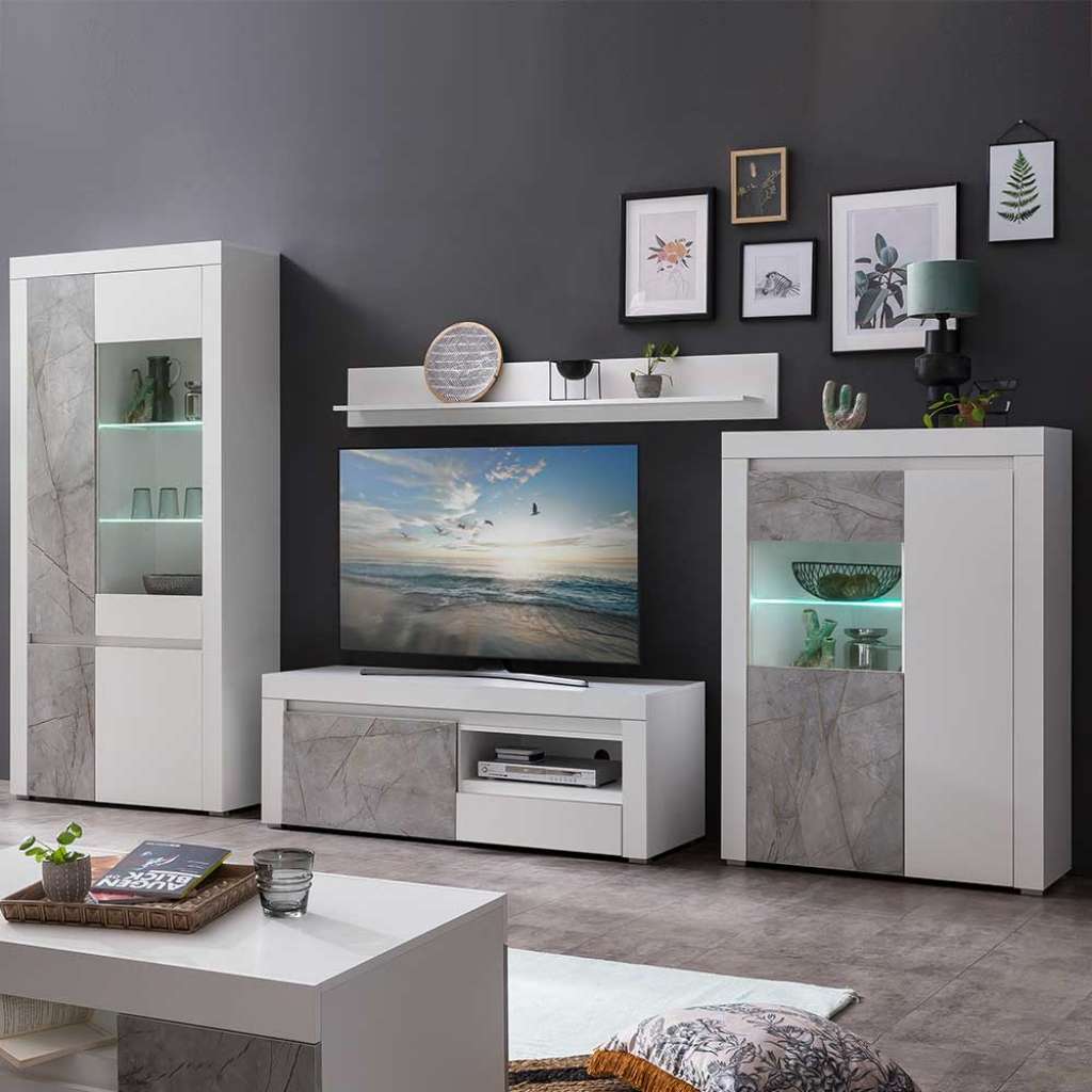 (vierteilig) - Schrankwand Wohnzimmer 330 cm Breit, 200 cm Hoch, 50 cm Tief - Wohnwand modern in Weiß und Grau - Melaminbeschichtet - Anbauwand aus Spanplatte - In modernem Design - Zerlegt, zum leichten Selbstaufbau (Montageanleitung liegt bei) - Vierteilig - Mit Kabeldurchlass an der RückwandVarianten - 001: Standardausführung - 002: mit LED Beleuchtung / für Energieeffizienzklasse LEDInformationen zur Lieferung:Der Versand dieses Artikels erfolgt per DHL-Superservice. Dieses beinhaltet folgenden Service für Sie:Terminvereinbarung: Sie werden frühzeitig (ein paar Tage im Voraus) durch die ausliefernde Spedition kontaktiert und Ihnen der Auslieferzeitpunkt mitgeteilt. Die Kontaktaufnahme erfolgt per Telefon. Bei telefonischer Nichterreichbarkeit werden Sie per Postkarte über das Auslieferdatum informiert.Lieferung Frei Verwendungsstelle: Der Transport erfolgt an Ort und Stelle. Sie bestimmen, wohin Sie die Ware getragen haben möchten. Ob Dachgeschoss, Erdgeschoss, Schlaf- oder Wohnzimmer - die Ware wird an den von Ihnen gewünschten Ort vertragen.Zwei Speditionsfahrer vertragen die Ware: keine Mithilfe beim Entladen und Vertragen der Ware nötig. Die Speditionsfahrer sind auf den Möbeltransport spezialisiert und entsprechend geschult, somit sind Transportreklamationen nahezu ausgeschlossen.Die Auslieferung erfolgt von Montags bis Freitags. Eine Zustellung an Sonn- und Feiertagen ist nicht möglich.Alle aufgeführten Serviceleistungen sind im Artikelpreis enthalten. Es fallen keine weiteren Kosten für Sie an. Bei Insellieferungen kann nur ein reiner Abgabeservice angeboten werden - das Vertragen der Ware + Verpackungsentsorgung entfällt hierbei.