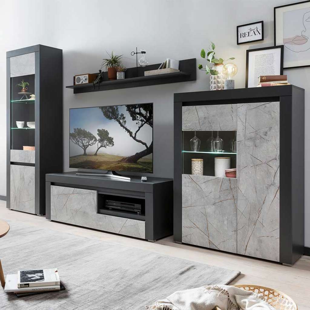 (vierteilig) - Wohnzimmerwand modern 299 cm Breit, 200 cm Hoch, 50 cm Tief - Wohnwand modern in Grau und Anthrazit - Melaminbeschichtet - Anbauwand aus Spanplatte - In modernem Design - Zerlegt, zum leichten Selbstaufbau (Montageanleitung liegt bei) - Vierteilig - Mit Kabeldurchlass an der RückwandVarianten - 001: Standardausführung - 002: mit LED Beleuchtung / für Energieeffizienzklasse LEDInformationen zur Lieferung:Der Versand dieses Artikels erfolgt per DHL-Superservice. Dieses beinhaltet folgenden Service für Sie:Terminvereinbarung: Sie werden frühzeitig (ein paar Tage im Voraus) durch die ausliefernde Spedition kontaktiert und Ihnen der Auslieferzeitpunkt mitgeteilt. Die Kontaktaufnahme erfolgt per Telefon. Bei telefonischer Nichterreichbarkeit werden Sie per Postkarte über das Auslieferdatum informiert.Lieferung Frei Verwendungsstelle: Der Transport erfolgt an Ort und Stelle. Sie bestimmen, wohin Sie die Ware getragen haben möchten. Ob Dachgeschoss, Erdgeschoss, Schlaf- oder Wohnzimmer - die Ware wird an den von Ihnen gewünschten Ort vertragen.Zwei Speditionsfahrer vertragen die Ware: keine Mithilfe beim Entladen und Vertragen der Ware nötig. Die Speditionsfahrer sind auf den Möbeltransport spezialisiert und entsprechend geschult, somit sind Transportreklamationen nahezu ausgeschlossen.Die Auslieferung erfolgt von Montags bis Freitags. Eine Zustellung an Sonn- und Feiertagen ist nicht möglich.Alle aufgeführten Serviceleistungen sind im Artikelpreis enthalten. Es fallen keine weiteren Kosten für Sie an. Bei Insellieferungen kann nur ein reiner Abgabeservice angeboten werden - das Vertragen der Ware + Verpackungsentsorgung entfällt hierbei.
