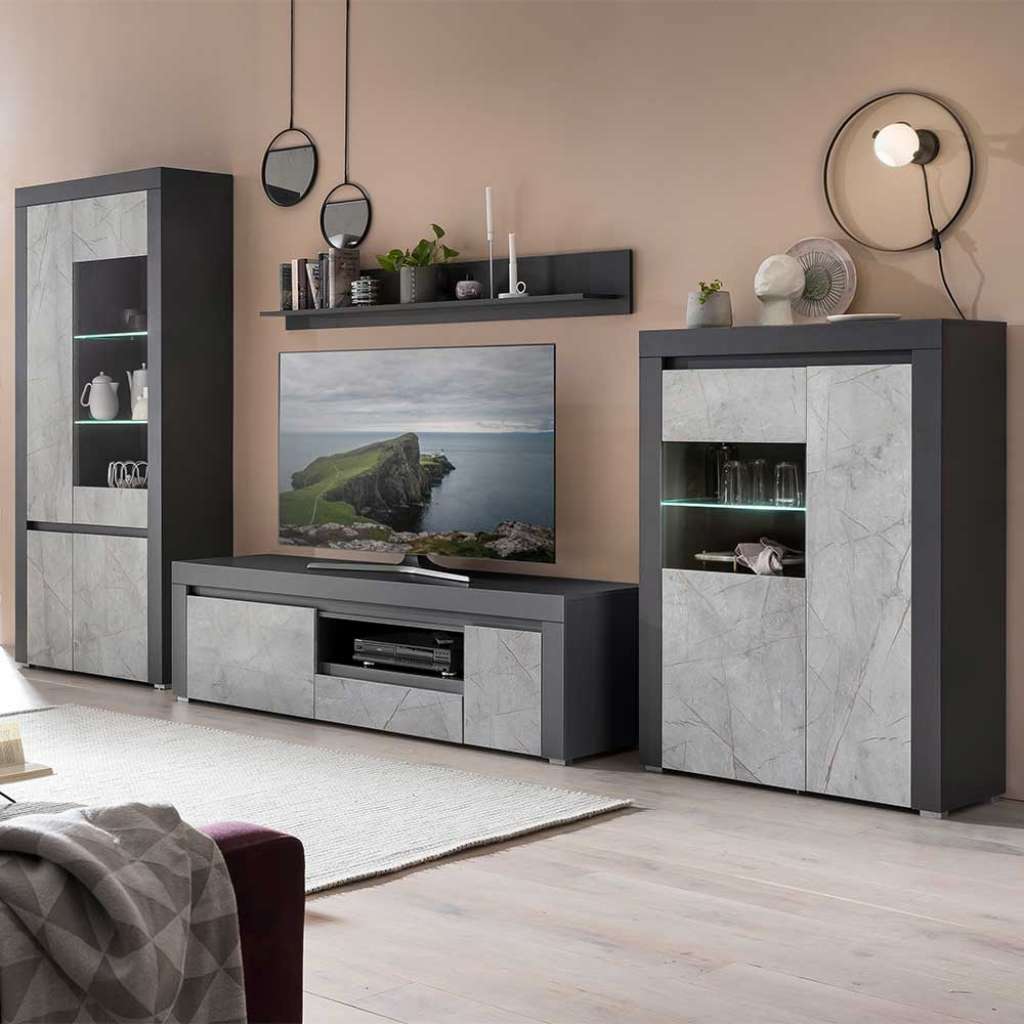 (vierteilig) - Wohnwand 350 cm 370 cm Breit, 200 cm Hoch, 50 cm Tief - Design Wohnwand in Grau und Anthrazit - Melaminbeschichtet - Anbauwand aus Spanplatte - In modernem Design - Zerlegt, zum leichten Selbstaufbau (Montageanleitung liegt bei) - Vierteilig - Mit Kabeldurchlass an der RückwandVarianten - 001: Standardausführung - 002: mit LED Beleuchtung / für Energieeffizienzklasse LEDInformationen zur Lieferung:Der Versand dieses Artikels erfolgt per DHL-Superservice. Dieses beinhaltet folgenden Service für Sie:Terminvereinbarung: Sie werden frühzeitig (ein paar Tage im Voraus) durch die ausliefernde Spedition kontaktiert und Ihnen der Auslieferzeitpunkt mitgeteilt. Die Kontaktaufnahme erfolgt per Telefon. Bei telefonischer Nichterreichbarkeit werden Sie per Postkarte über das Auslieferdatum informiert.Lieferung Frei Verwendungsstelle: Der Transport erfolgt an Ort und Stelle. Sie bestimmen, wohin Sie die Ware getragen haben möchten. Ob Dachgeschoss, Erdgeschoss, Schlaf- oder Wohnzimmer - die Ware wird an den von Ihnen gewünschten Ort vertragen.Zwei Speditionsfahrer vertragen die Ware: keine Mithilfe beim Entladen und Vertragen der Ware nötig. Die Speditionsfahrer sind auf den Möbeltransport spezialisiert und entsprechend geschult, somit sind Transportreklamationen nahezu ausgeschlossen.Die Auslieferung erfolgt von Montags bis Freitags. Eine Zustellung an Sonn- und Feiertagen ist nicht möglich.Alle aufgeführten Serviceleistungen sind im Artikelpreis enthalten. Es fallen keine weiteren Kosten für Sie an. Bei Insellieferungen kann nur ein reiner Abgabeservice angeboten werden - das Vertragen der Ware + Verpackungsentsorgung entfällt hierbei.