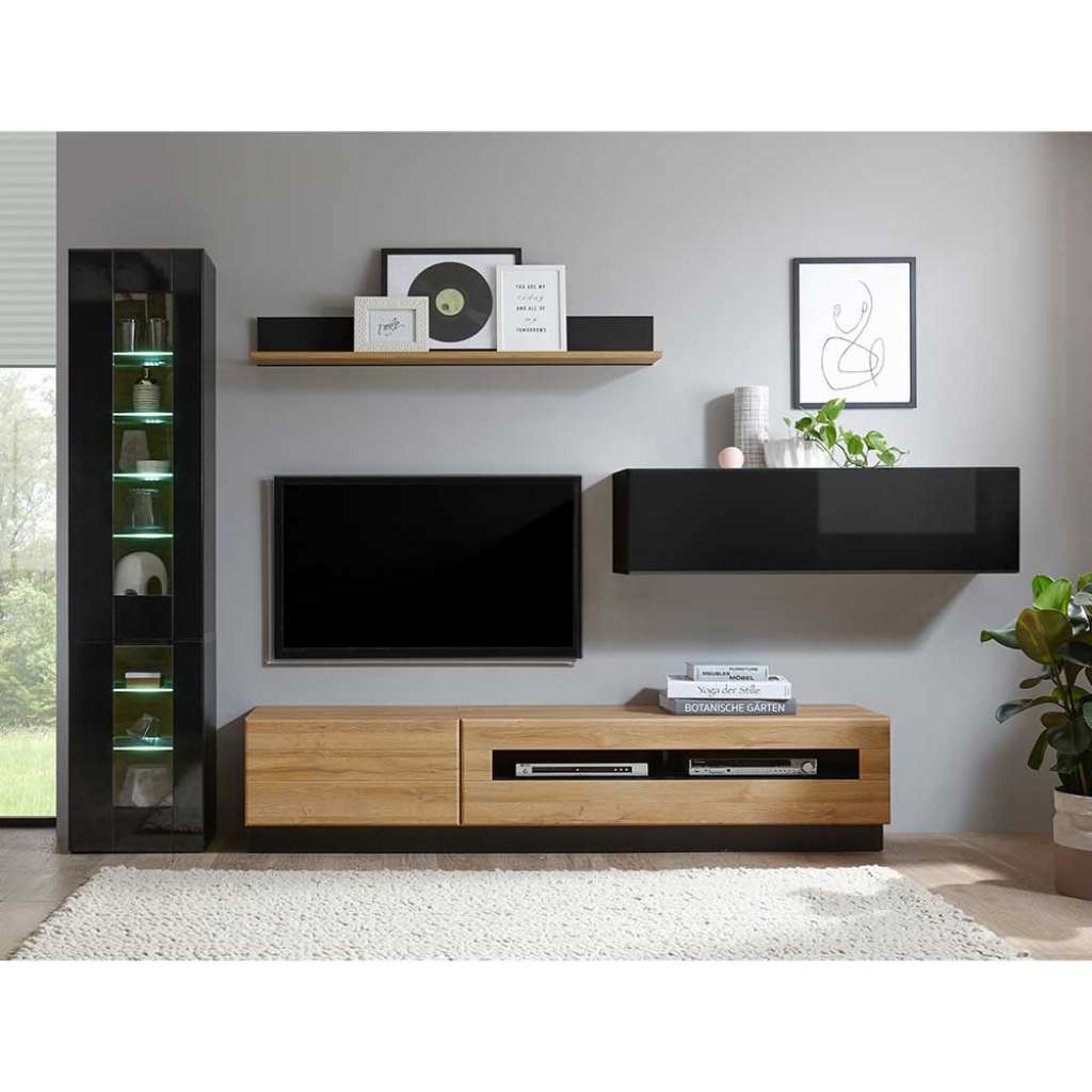 Informationen über Designer Wohnwand in Schwarz Hochglanz Wildeiche Optik (6-teilig)