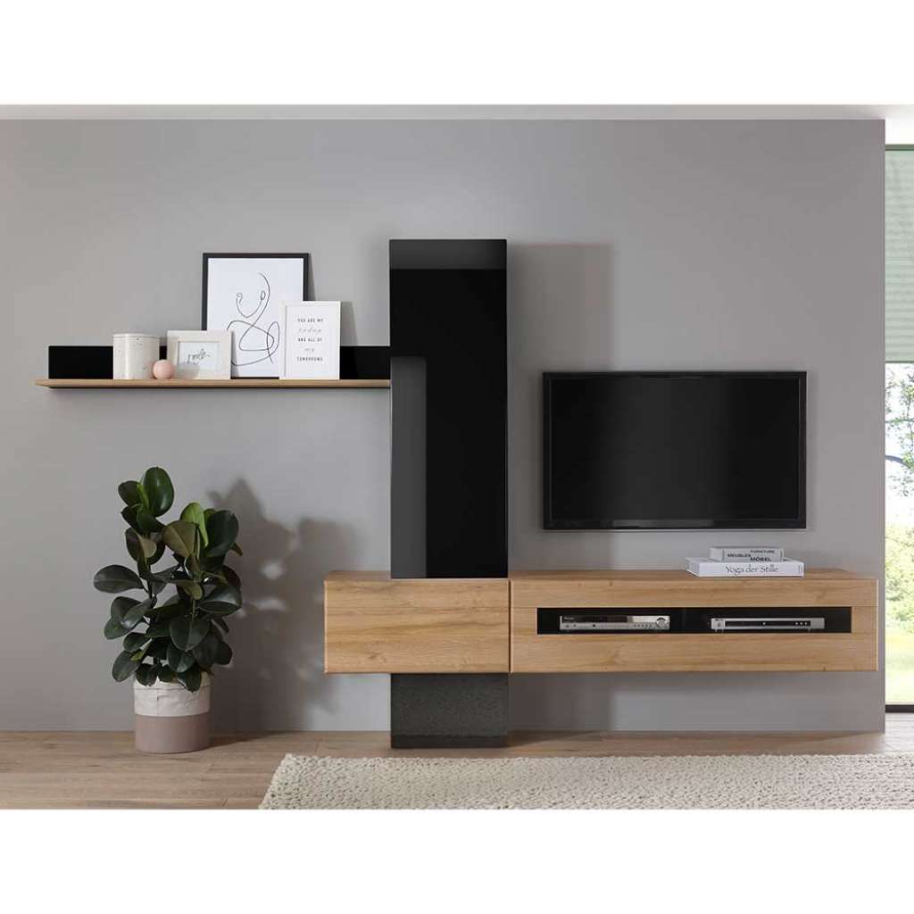 Informationen über Hängende Wohnwand in Schwarz Hochglanz und Wildeiche Optik 210 cm breit (5-teilig)