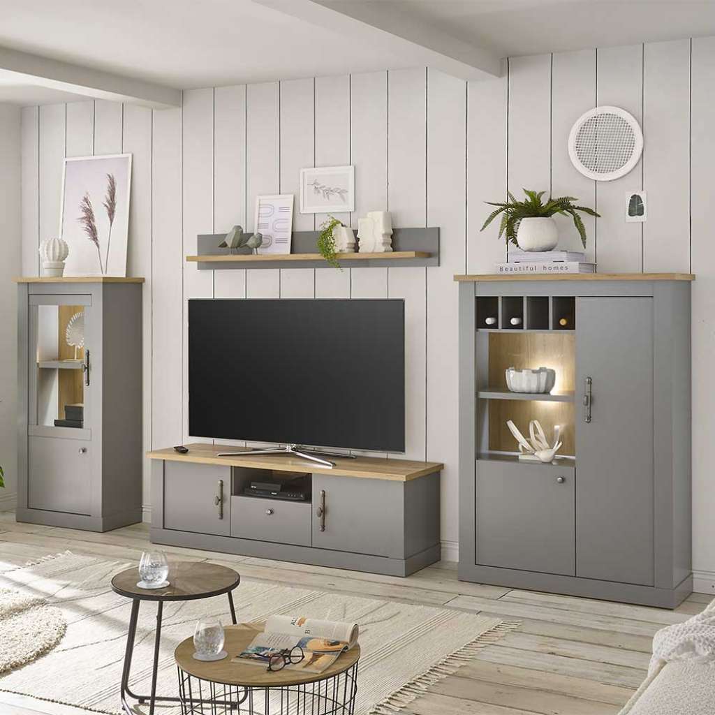 Informationen über Landhaus Wohnzimmerwand in Lichtgrau Eichefarben (vierteilig)