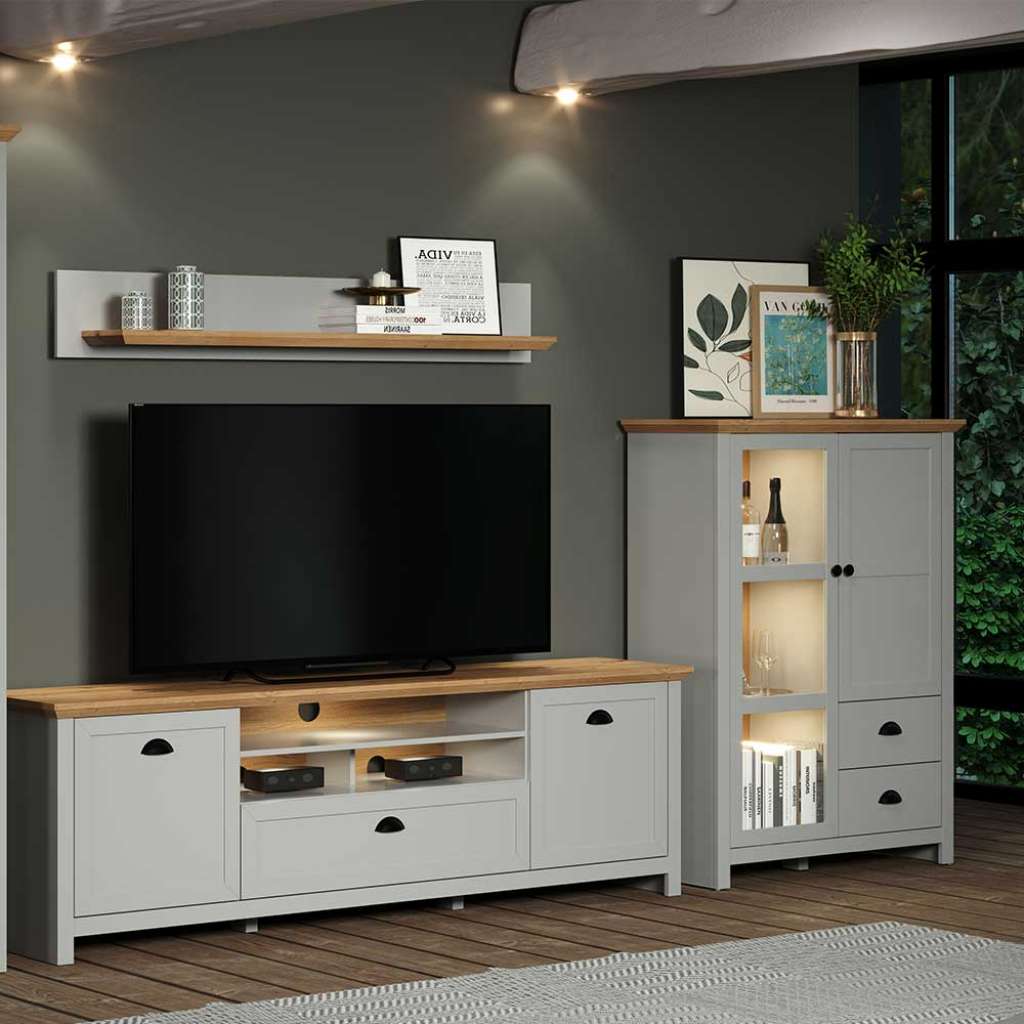 Schrankwand Landhaus Stil in Lichtgrau Wildeichefarben (dreiteilig)
