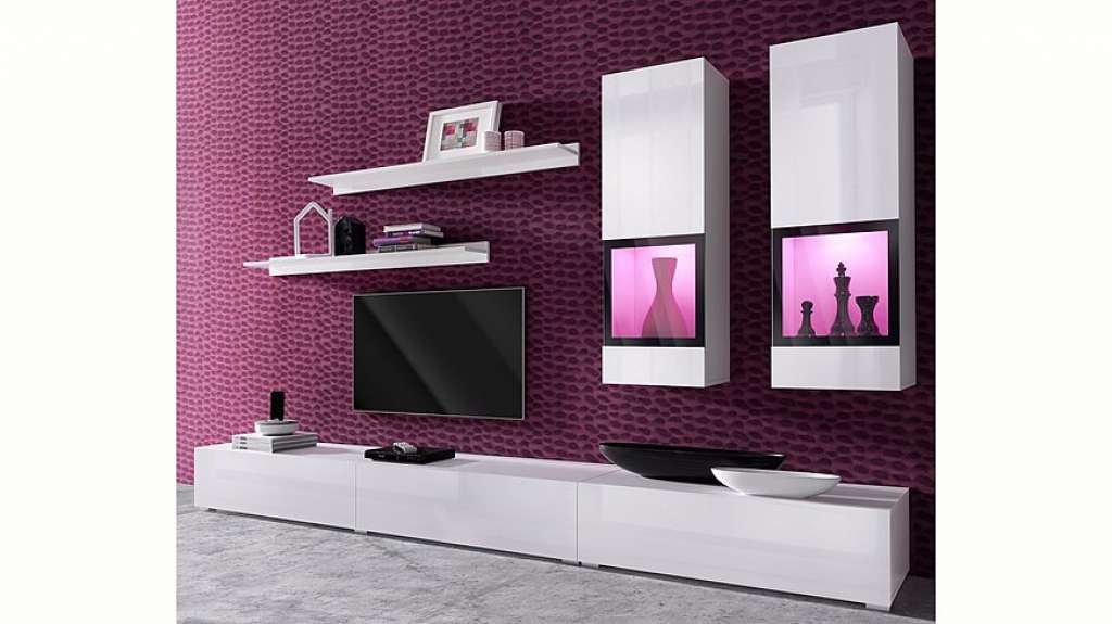 Modern und leicht ist die im Trend liegende 6-teilige Wohnwand »Baros«. Die Wohnkombination ist so konzipiert, dass sie das Gesamtbild eines jungen offenen Wohnens wunderschön hervorhebt. 2 Hängevitrinen, 2 Lowboards und 2 Wandregale bieten viel Platz für einen Fernseher, Wohnaccessoires und kreative Gestaltungsideen. Die Vitrinentüren sind zum Teil verglast und überzeugen mit ihrer hochwertigen Optik. Passende Beleuchtungssysteme setzen hier abgestellte Vasen, Gläser oder andere Deko-Gegenstände perfekt in Szene. Hochglänzende Fronten und Ganzmetall-Scharniere verleihen der schicken Wohnwand »Baros« einen bezaubernden Charme, der jedes Wohnambiente elegant bereichert.