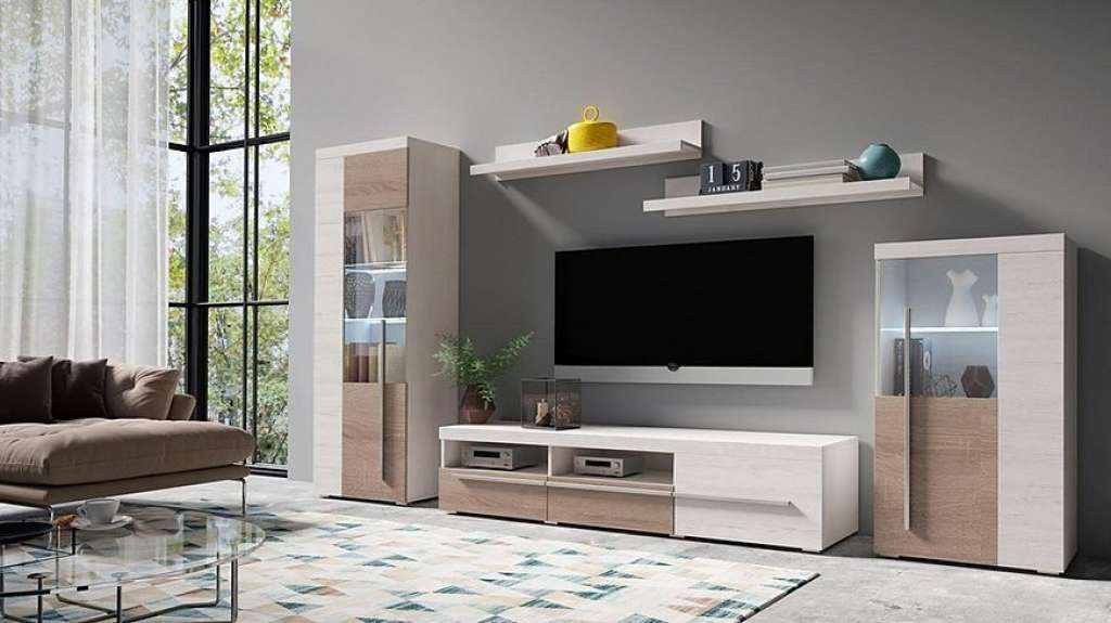 Eine Wohnwand, die Geborgenheit spendet und zum Wohlfühlen einlädt. Im Wohnzimmer verbringt man die meiste Zeit. Ob zum geselligen Spieleabend mit der ganzen Familie, beim Fernsehen zum Tagesausklang, oder bei einer Tasse Tee, wenn es draußen zu ungemütlich wird. Die 5-teilige Wohnwand, bestehend aus Vitrinen, Wandregalen und einem TV-Lowboard verleiht dem Zuhause eine geordnete und moderne Ausstrahlung. Auf den vielen Ablagemöglichkeiten kann man Bücher und die Plattensammlung drapieren und einige Erinnerungsfotos aufstellen. Ein kuscheliger Teppich und eine einladende Couch davor werden quasi zum Magneten für jedermann im Haushalt. So wird die Wohnwand optimal zur Geltung gebracht.