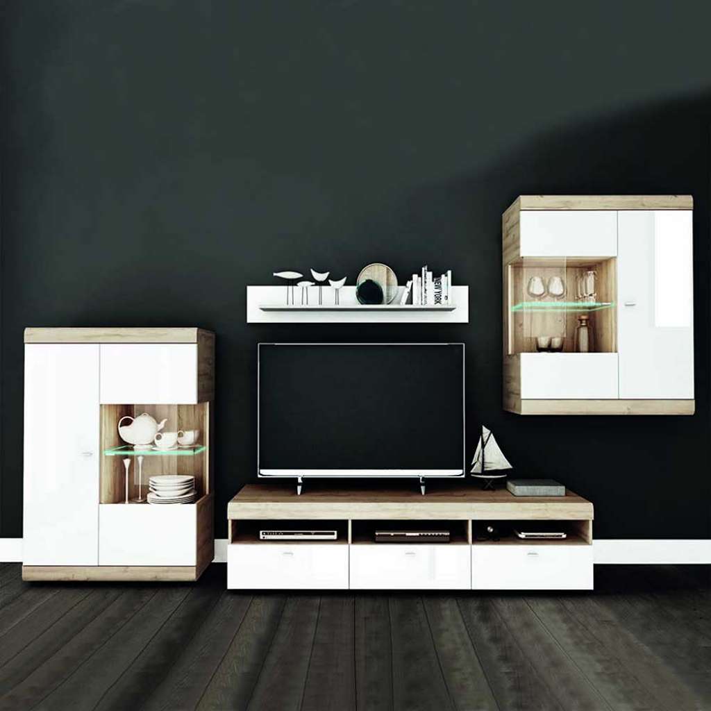 - Wohnzimmerschrank Weiß und Wildeichefarben - Schrankwand Spanplatte - Wohnwand Modern - Anbauwand Breite: 318 - Wohnwand modern Höhe: 200 - Wohnwand hochglanz Tiefe: 47 - Wohnzimmer schrank Modernem Hochglanz - Schrankwand wohnzimmer Mehrteilig: 4-teilig - Wohnzimmerwand Zerlegt, zum leichten Selbstaufbau (Montageanleitung liegt bei) - Wohnzimmer anbauwand Melaminbeschichtet und Lackiert - Tv wohnwand Metallgriffen - Tv wohnwand modern Griff Form: Griffleiste Varianten - Wohnzimmerwand modern 001: Beleuchtung: Ohne Beleuchtung / Energieeffizienzklasse: - Wohnzimmerschrankwand 002: Beleuchtung: LED Beleuchtung / Energieeffizienzklasse: LED