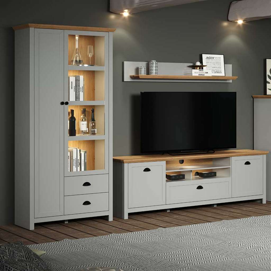 Informationen über Wohnzimmer Anbauwand Landhausstil in Lichtgrau Wildeichefarben (dreiteilig)