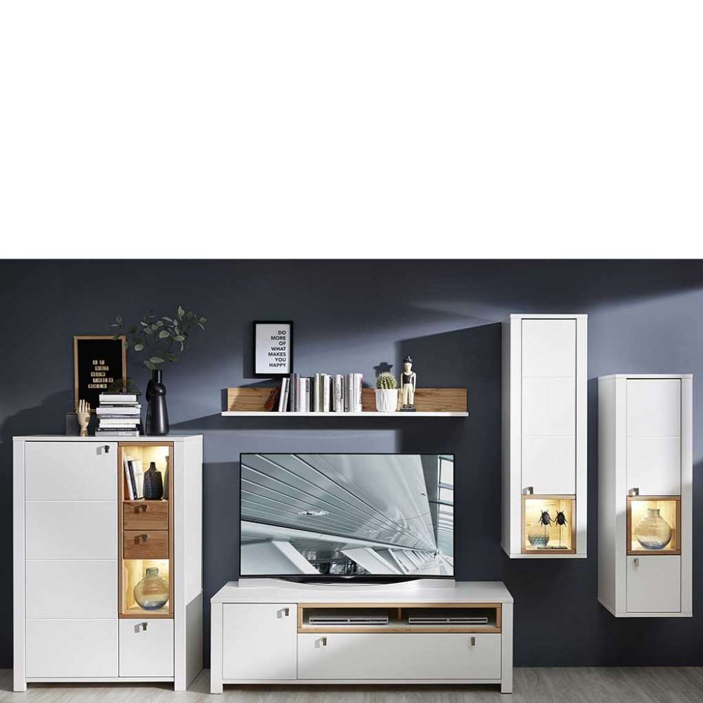 Wohnzimmerwand in Weiß und Wildbuche Optik LED Beleuchtung (5-teilig)