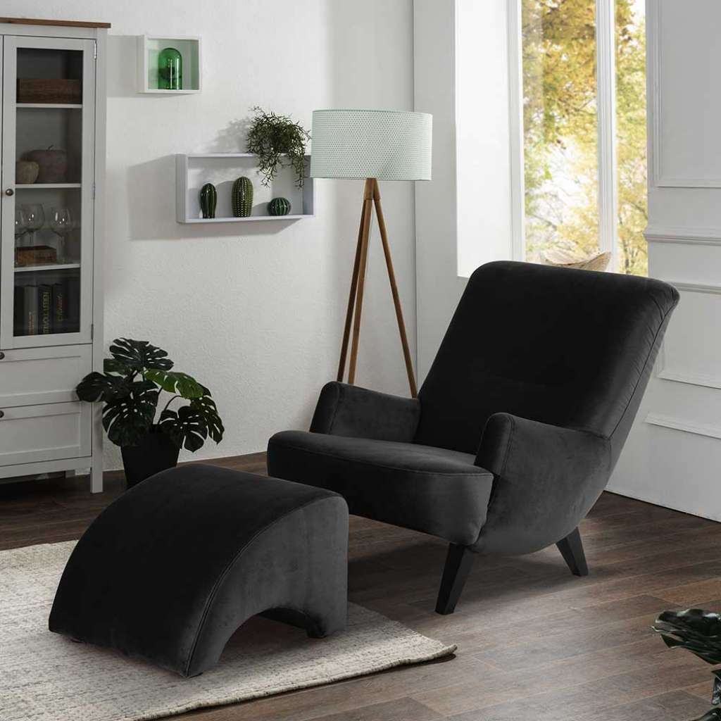 TV Sessel schwarz modern aus Samtvelours Vierfußgestell aus Holz