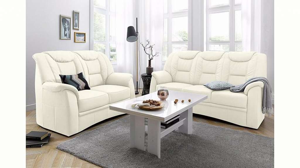 Details: Inklusive komfortablen Federkerns. Frei im Raum stellbar. In der Lieferung sind keine Zierkissen enthalten. In verschiedenen Bezugsqualitäten erhältlich. In hochwertiger Verarbeitung. In verschiedenen Farbkombinationen erhältlich. Füsse aus Kunststoff. Hoher Sitzkomfort. Trendiges Design. Sitzkomfort: Komfortable Wellenunterfederung. Komfortabler Federkern. Atmungsaktive Polyätherschaum-Polsterung. Stabiles Holzuntergestell. Straffe, feste Polsterung. Generelle Masse: 193/143/98 cm Gesamtbreite (3-Sitzer/2-Sitzer/Sessel). 105 cm Höhe. Sitzbreite zwischen den Armlehnen: 140/90/45 cm (3-Sitzer/2-Sitzer/Sessel). 101 cm Gesamttiefe. 45 cm Sitzhöhe. 57 cm Sitztiefe. 66 cm Armlehnen-Höhe. 27 cm Armlehnen-Breite. 100 cm Armlehnen-Tiefe. Höhe der Füsse: 2 cm. Alle Masse sind ca.-Masse. Bezüge/Qualitäten: Microfaser PRIMABELLE® (100% Polyester). Kunstleder SOFTLUX®. NaturLEDER® (echtes Rindsleder) in Sitz und Rücken. Korpus in passendem Kunstleder SOFTLUX® bezogen. NaturLEDER®: Bitte beachten Sie, dass Lederbezüge mehr Nähte aufweisen als Stoffbezüge. Pflegehinweise: * Sorgfältig entstauben * Mit einem weichen, sauberen und feuchtem Tuch und leichter Seifenlauge reinigen * Benutzen Sie keine Scheuermittel wie Pulver, Stahlwolle, Lösungsmittel * Nicht zu nass abwischen . FSC®-zertifiziert: Das Label des FSC® weist nach, dass Sie mit dem Kauf dieser Produkte vorbildliche Waldwirtschaft - nach den strengen ökologischen, sozialen und wirtschaftlichen Standards des Forest Stewardship Council® - fördern und die Waldressourcen schonen. Set: 3-Sitzer + 2-Sitzer