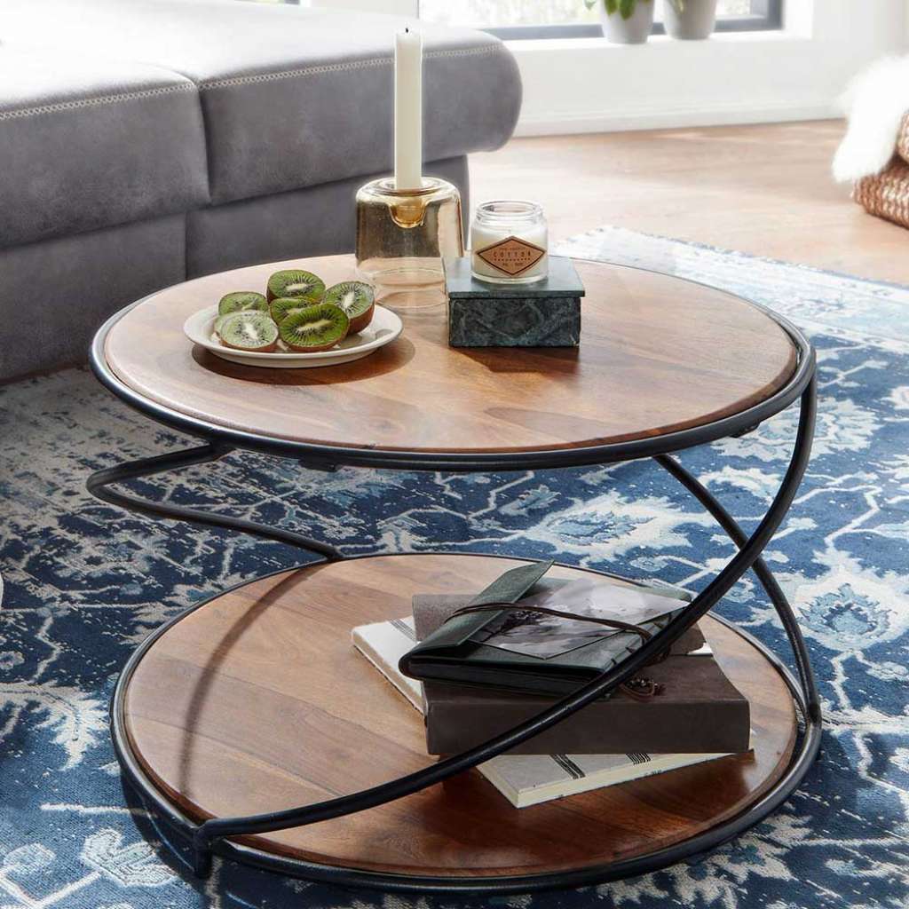 Runder Couchtisch aus Sheesham Massivholz und Metall 58 cm Durchmesser